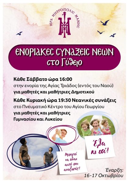 Έναρξη πνευματικών δράσεων στην πόλη του Γυθείου με Εσπερινό Κήρυγμα Κάθε Κυριακή και Κύκλους Μελέτης της Αγίας Γραφής. Στο μεταξύ, ξεκινούν Ενοριακές Συνάξεις Νέων για μαθητές Δημοτικού, Γυμνασίου και Λυκείου.