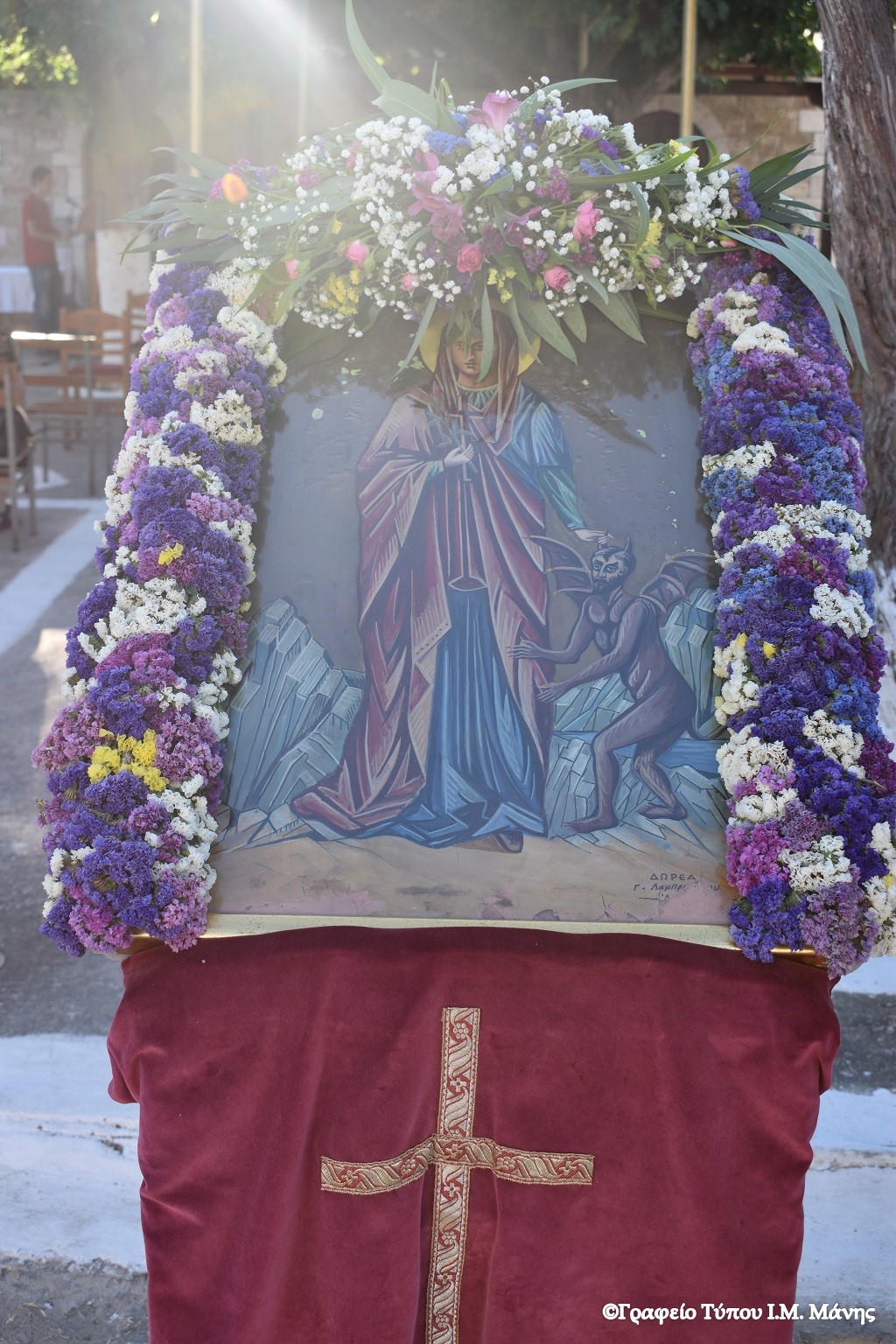 Το απόγευμα της Παρασκευής 16 Ιουλίου 2021, τον Πανηγυρικό Εσπερινό ετέλεσε ο αρχιμ. π. Συμεών Λαμπρινάκος, Πρωτοσύγκελλος της Ιεράς Μητροπόλεως Μάνης και την κυριώνυμο ημέρα, το Σάββατο 17/7 τέλεσε την Θεία Λειτουργία ο Σεβ. Μητροπολίτης Μάνης κ. Χρυσόστομος Γ’, ο οποίος και στο κήρυγμά του αναφέρθηκε στη δύναμη της πίστεως η οποία νικά το κακό, όπως κατόρθωσε τούτο και η Αγία Μαρίνα.