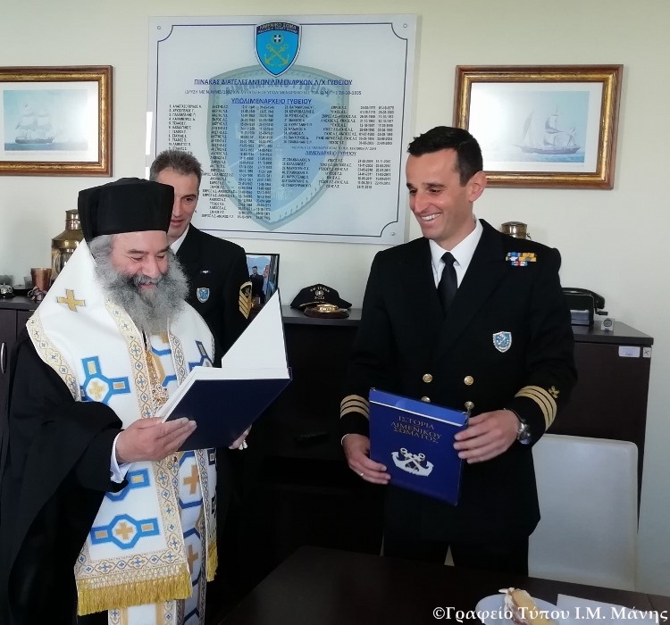 Από τη πλευρά του, ο Λιμενάρχης Γυθείου κ. Γιαννουράκος, ευχαρίστησε το Σεβασμιώτατο για την παρουσία του προσφέροντάς του ως ενθύμιο ένα βιβλίο με την ιστορία του Λιμενικού Σώματος.