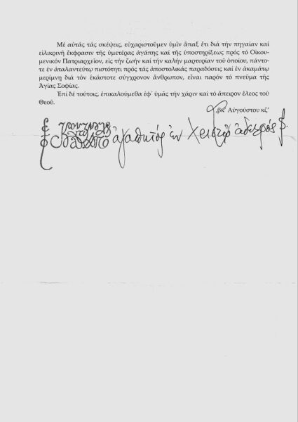 Επιστολή Πατριάρχου προς τον Μητροπολίτη Μάνης για την Αγία Σοφία