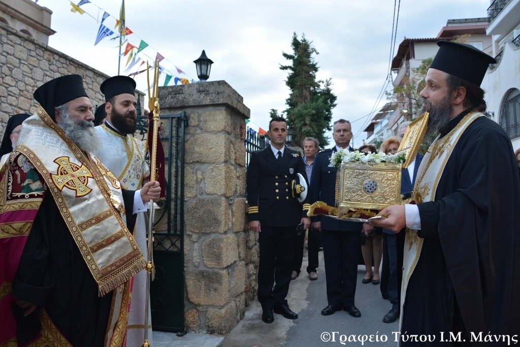 Μετά την υποδοχή της τιμίας κάρας, υπό του Σεβ. Μητροπολίτου Μάνης κ. Χρυσοστόμου Γ’, πλαισιουμένου υπό πλειάδος ιερέων της Ιεράς Μητροπόλεώς, τελέσθηκαν ο Αρχιερατικός Εσπερινός και το Ιερό Μυστήριο του Ευχελαίου.