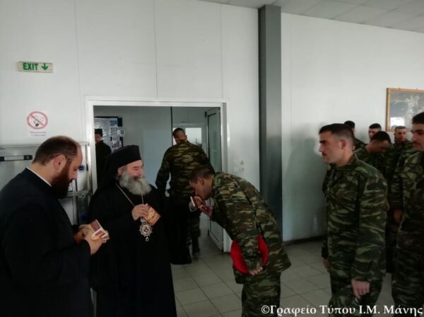 Ο Σεβασμιώτατος Μητροπολίτης Μάνης κ. Χρυσόστομος Γ’, κατόπιν προσκλήσεως μετέβη σήμερα, στο στρατόπεδο «3ο Τάγμα ΚΕΕΜ – Σχολή Μαγείρων – Τχη (ΠΖ) Παναγιώτη Μαντούβαλου» στο Γύθειο, όπου έχει αφιχθεί η νέα σειρά στρατευσίμων οπλιτών και αφού έτυχε θερμής υποδοχής από τον Διοικητή του ΚΕΕΜ, Ταξίαρχο κ. Χρυσακόπουλο και την Διοικήτρια του Τάγματος, Αντισυνταγματάρχη κα Φραγκιάδου, τέλεσε τον καθιερωμένο αγιασμό, πλαισιούμενος από τον εντεταλμένο για το Στρατό, υπεύθυνο ιερέα της Μητροπόλεώς, π. Ηλία Μανιατάκο, προς ευλογίαν αξιωματικών, υπαξιωματικών και οπλιτών.