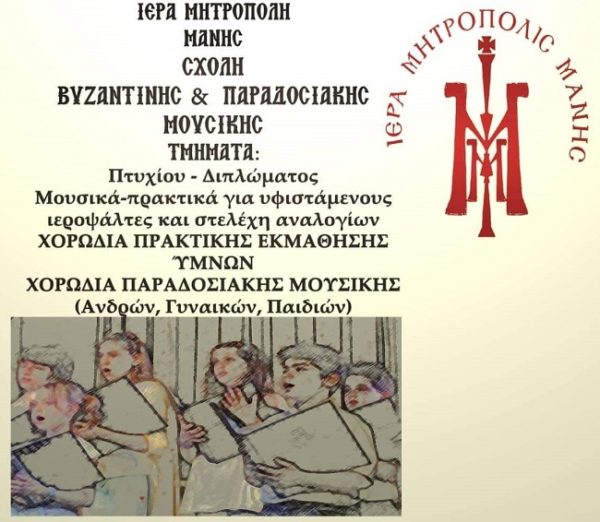 Από την Ιερά Μητρόπολη Μάνης ανακοινώνεται ότι, με την ευλογία του Σεβασμιωτάτου Μητροπολίτου Μάνης κ. Χρυσοστόμου Γ’, ξεκινούν και φέτος οι εγγραφές και τα μαθήματα στη Σχολή Βυζαντινής και Παραδοσιακής Μουσικής (Τμήματα Πτυχίου – Διπλώματος, μουσικά πρακτικά για υφιστάμενους ιεροψάλτες και στελέχη αναλογίων, χορωδία πρακτικής εκμάθησης ύμνων, χορωδία παραδοσιακής μουσικής).