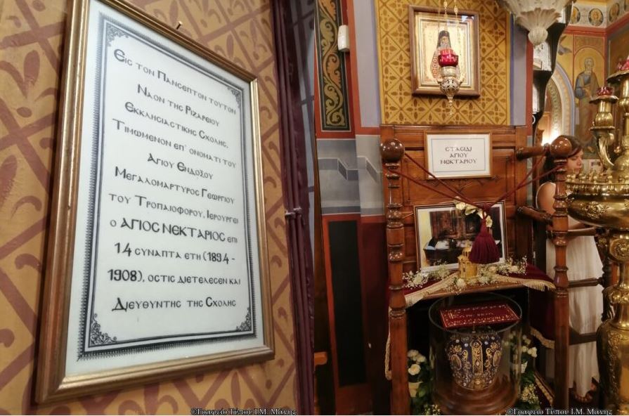 Την Κυριακή 6 Σεπτεμβρίου 2020 και στον Ι.Ναό Αγ. Γεωργίου της «παλαιάς» Ριζαρείου Εκκλησιαστικής Σχολής, όπου διετέλεσε Διευθυντής ο Αγ. Νεκτάριος επί 14 χρόνια, επί της λεωφόρου Βασιλ. Σοφίας στην Αθήνα, μετά το πέρας της Θ. Λειτουργίας, όπου ιερούργησε ο Σεβ. Μητροπολίτης Μάνης κ. Χρυσόστομος Γ’, κατόπιν κανονικής αδείας και ευλογίας του Μακ. Αρχιεπισκόπου Αθηνών και πάσης Ελλάδος κ. Ιερωνύμου, το αρχαιότερο των μελών του Δ.Σ. της Ριζαρείου Σχολής, καθηγητής κ. Κων. Φαφαλιός απένειμε το μετάλλιον της Σχολής, των εκατό ετών από της οσιακής κοιμήσεως του Αγίου, τιμής ένεκεν, για την αγάπη του προς τον Άγιο αλλά και για την λογιότητά του και το ήθος του, ως ανέφερε στην προσλαλιά του ο καθηγ. κ. Τσακίρης, εκ μέρους του Δ.Σ. της Ριζαρείου Σχολής.