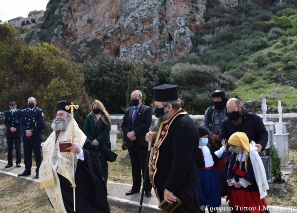 Ακολούθως, ο Σεβασμιώτατος μετέβη στο Κοιμητήριο Αγ. Σώζοντος στο Λιμένι Οιτύλου, όπου ενώπιον της προτομής του μεγάλου εθνεγέρτου αντιστρατήγου ήρωος Πετρόμπεη Μαυρομιχάλη, τέλεσε Τρισάγιο υπέρ αναπαύσεως της ψυχής του.