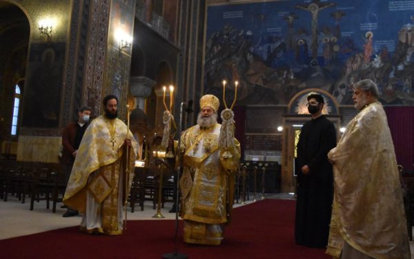 Ο Σεβασμιώτατος ήταν πλαισιούμενος από τους ιερείς του ναού, τον προϊστάμενο π. Παναγιώτη Καχρίλα, τον αρχιμ. π. Θεοφάνη Δαρζέντα και τον διάκονο π. Φιλούμενο Καϊταλίδη, οι οποίοι είχαν όλα για την Θεία Λειτουργία προετοιμάσει κατ’ άριστον τρόπον και με την δέουσα ιεροπρέπεια.