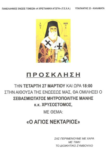 Ο Μητροπολίτης Μάνης κ. Χρυσόστομος θα μιλήσει με θέμα “Ο Άγιος Νεκτάριος”, την Τετάρτη 27 Μαρτίου στις 18:00, στην αίθουσα της Πανελλήνιας Ένωσης Γονέων “Η Χριστιανική Αγωγή”, στην Καλαμάτα.