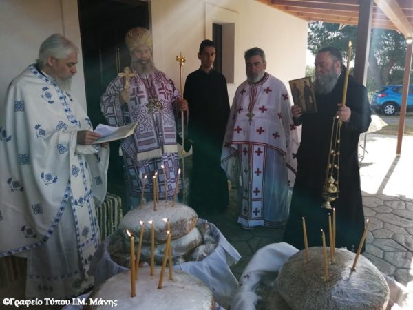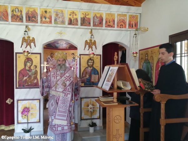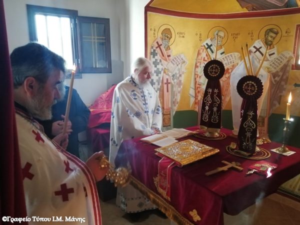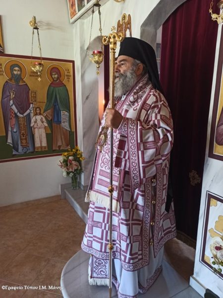Ο Σεβασμιώτατος τέλεσε την Θεία Λειτουργία πλαισιούμενος από τους ιερείς πρωτοπρ. π. Στέφανο Ταβουλάρη, πρωτοπρ. π. Σταύρο Βλαστέλλη και πρεσβ. π. Σπυρίδωνα Κοτζαμπασάκη. Στο αναλόγιο έψαλε ο πρωτοψάλτης κ. Ανάργυρος Δερδελάκος.
