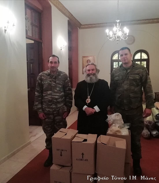 Σήμερα, Πέμπτη 19 Δεκεμβρίου 2019, αντιπροσωπεία του ΚΕΕΜ, με επικεφαλής τον υποδιοικητή του 3ου Τάγματος, που εδρεύει στο Γύθειο, Ταγματάρχη κ. Ποντικίδη, επισκέφθηκε την Ιερά Μητρόπολή Μάνης, για να ενισχύσουν με τη δική τους συμβολή το Κοινωνικό Παντοπωλείο της Ιεράς Μητροπόλεως, προσφέροντας τρόφιμα μακράς διαρκείας.