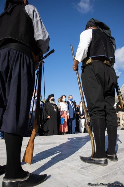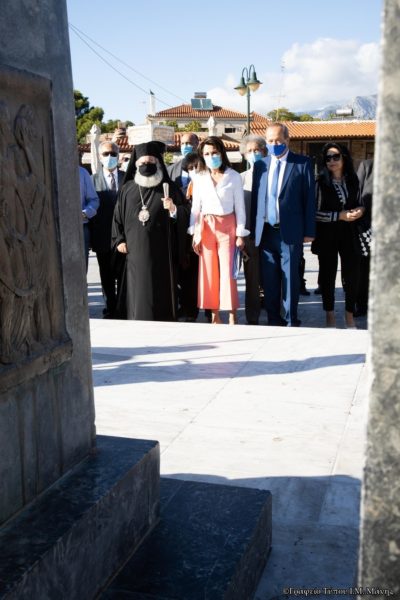 Τέλος ο Σεβασμιώτατος προσέφερε στην κυρία Αγγελοπούλου ένα βιβλίο του και εκείνη ένα συλλογικό νόμισμα της Επετείου.