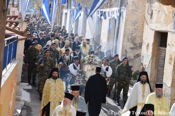 Στην κεντρική πλατεία της πόλης, πλατεία «Πετρόμπεη Μαυρομιχάλη» ο Σεβ. Ποιμενάρχης μας κ. Χρυσόστομος Γ’, επισφραγίζοντας την εόρτια σύναξη είπε με στεντορεία φωνή: «Εορτάζουμε πανδήμως και μεγαλοπρεπώς αλλά και με πάσαν ιεροπρέπεια την Υπαπαντή του Κυρίου ημών Ιησού Χριστού. Δεσποτική άμα τε Θεομητορική εορτή. Μεγάλη εορτή της Εκκλησίας μας. Υπαπαντή σημαίνει προϋπάντηση, συνάντηση με τον Χριστό. Και όταν προσεγγίσεις, συναντήσεις, βιώσεις τον Χριστό τότε αρχίζεις να καταλαβαίνεις μέσα σου ότι ο Χριστός είναι η οδός, η αλήθεια και η ζωή. Είναι το ύδωρ το ζών, είναι ο Άρτος της ζωής, είναι ο Καλός Ποιμήν, ο Καλός Σαμαρείτης, η Άμπελος, η Ανάστασις, το Φώς του κόσμου. Γι’ αυτό λέγει ο Χριστός «ὁ ἀκολουθῶν ἐμοὶ οὐ μὴ περιπατήσῃ ἐν τῇ σκοτίᾳ, ἀλλ᾿ ἕξει τὸ φῶς τῆς ζωῆς» (Ιω. 8,12). Η εποχή μας είναι, όλοι το ξέρουμε και το διαπιστώνουμε καθημερινώς, δύσκολη. Ακοές πολέμων, ανασφάλειες, ηθική κρίση, παρακμή, απαξίωση αρχών ζωής, ανομία και συγχρόνως κενό της ψυχής, πολλά ψυχολογικά προβλήματα, βάσανος των ανθρώπων. Σ’ αυτή την χοάνη της άκριτης παγκοσμιοποίησης, της αποϊεροποίησης, του αθεϊσμού και της νεοειδωλολατρίας, μας προσκαλεί ο Χριστός. Κτυπά διακριτικά την θύρα της ψυχής μας. Μας λέγει: «Ὑμεῖς ἐστε τὸ φῶς τοῦ κόσμου». Είμαστε εμείς οι χριστιανοί το φώς. Αυτό το φώς πήραν οι άγιοι Απόστολοι, ένας μέγας Απόστολος των Εθνών Παύλος και το μετέδωσε το Ευαγγέλιο του Χριστού στην Οικουμένη. Οι Τρείς Ιεράρχες το φώς του χριστιανισμού σε μια σύζευξη με τον ελληνισμό έφεραν τον ελληνοχριστιανικό πολιτισμό. Ο όσιος Νίκων ο Μετανοείτε το έφερε εδώ στην Μάνη. Και σήμερα με το ραβδί στο χέρι εξακολουθεί να διατρέχει τα βουνά μας, τις πόλεις και τα χωριά μας και να φωνάζει το «Μετανοεῖτε». Ένας Κοσμάς Αιτωλός θα πεί σ’ άλλα δύσκολα χρόνια «Χριστός και Ελλάδα μας χρειάζονται». Ο Χριστιανισμός είναι η αρίστη θρησκεία του κόσμου. Σας καλώ, λοιπόν, ως Επίσκοπος και Μητροπολίτης της ιστορικής αυτής Ιεράς Μητροπόλεως να σφυριλατήσετε το ομόψυχον του Γένους μας. Σας καλώ σ’ ένα ξαναζωντάνεμα της ορθοδόξου πίστεως. Σας καλώ να παραμείνετε άγρυπνοι βιγλάτορες επί των πνευματικών επάλξεων, μαχητές και φύλακες των ιερών και οσίων της πίστεως και της πατρίδος. Μη λυγίζετε. Μη δειλιάζετε. Μη πτοείσθε. Μην αθετείτε τους λόγους του Κυρίου. Μην αμαρτάνετε. Μην περιφρονείτε τις θείες εντολές. Μην βεβηλώνετε τα «αγιάτικα». Προσέχετε, λειτουργούν και οι πνευματικοί νόμοι και «φοβερόν εστί τό εμπεσείν εις χείρας Θεού ζώντος». Ανδρίζεσθε, κραταιούσθε, προσεύχεσθε, ειρηνεύετε στήκετε εν τη πίστει, είναι οι προτροπές, τα συνθήματα, του μεγάλου Αποστόλου των εθνών Παύλου. Ξέρετε, όταν διαβαίνουν οι αετοί από τον Ταΰγετο χαμηλώνουν τα φτερά τους και χαιρετάνε την ηρωϊκή και αδούλωτη Μάνη! Τούτος ο τόπος δίδαξε στα έθνη παλληκαριά, ανδρειωσύνη, ελεύθερο πνεύμα, αξίες ύψιστες: Πίστη στο Θεό και Αγάπη στην πατρίδα. «Μέσα μας τρέχει ηρώων αίμα, Είμαστε απόγονοι μαρτύρων». Τ’ άκουσες κορώνα μου; Κορώνι μου! Πίστη στο Θεό, αγάπη στην Ελλάδα μας. Αυτή την εύσημο ημέρα αποδίδουμε: Τιμή στους ήρωες. Τιμή στους προγόνους μας. Τιμή στα μνημεία μας (ναούς – μονές – πύργοι – κάστρα). Τιμή στη σημαία. Εύχομαι η Παναγία η Γιάτρισσα που διαφεντεύει από ψηλά τον Ταΰγετο να μας φυλάττει και η Υπαπαντή βοήθεια όλων μας».
