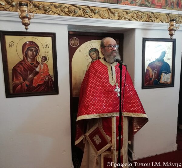 Στην φωτογραφία που ακολουθεί ο αείμνηστος π. Χρυσόστομος κηρύττει τον θείο λόγο κατά τη διάρκεια της Αρχιερατικής Θείας Λειτουργίας στον Ι.Ν. Αγ. Σπυρίδωνος Μαυροβουνίου Γυθείου στις 12/12/2018:
