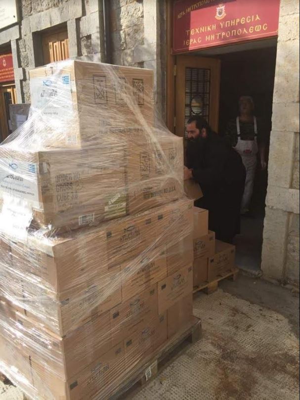 Ἡ Ἱερά Μεγίστη Μονή Βατοπαιδίου καί ὁ καθ’ ὅλα ἄξιος Καθηγούμενος αὐτῆς κ. Ἐφραίμ προσέφεραν 1.000 κιλά τρόφιμα (μακαρόνια, ρύζι, φακές, ζάχαρη, φασόλια, τοματοπελτέ κ.ἄ.) καί ἤδη ἔχει ἀποστείλει στή Μητρόπολή μας καί ποσότητα 1.000 κιλῶν κρέατος.