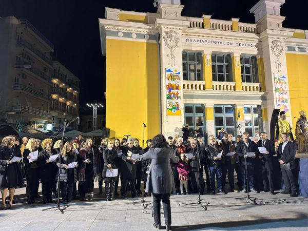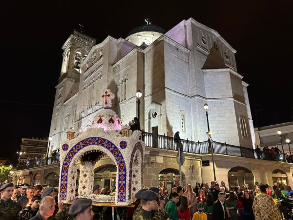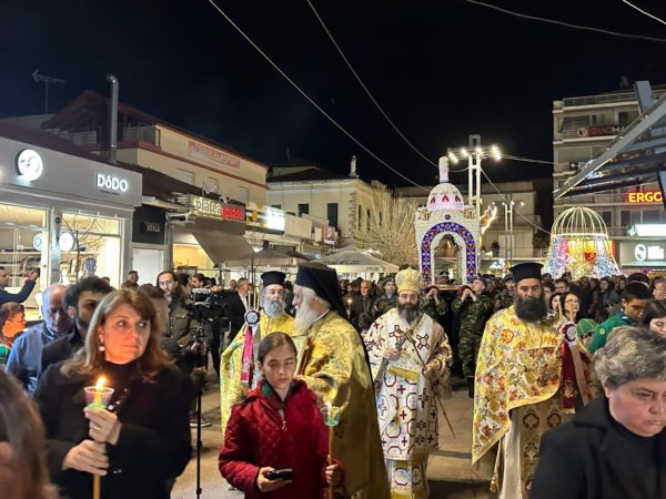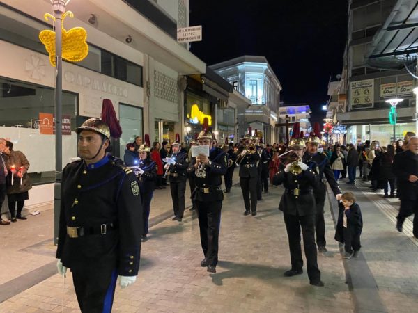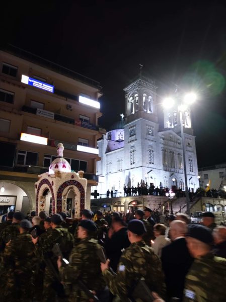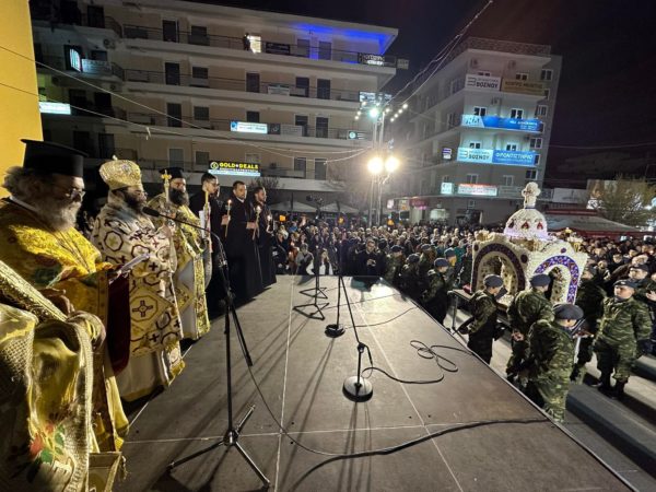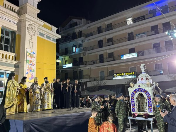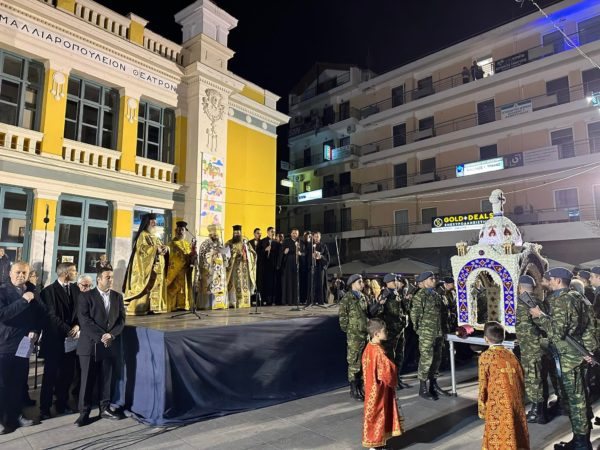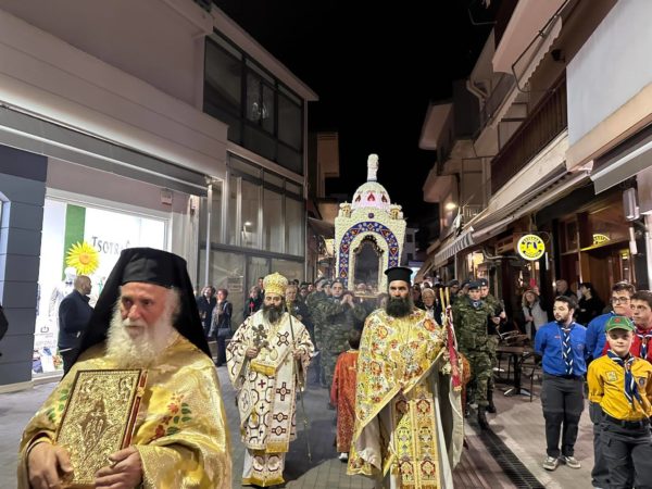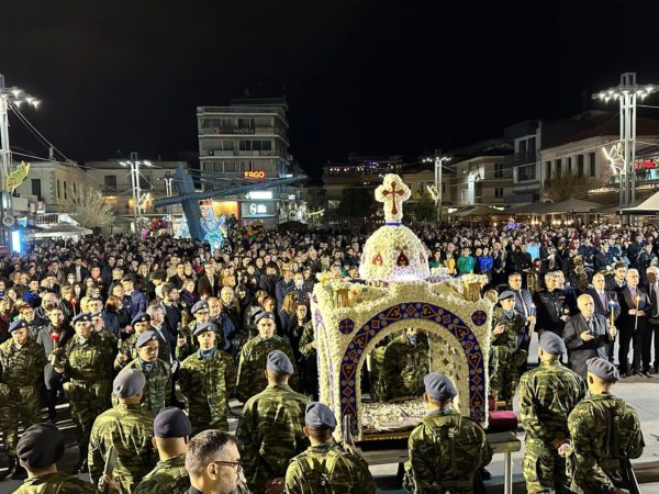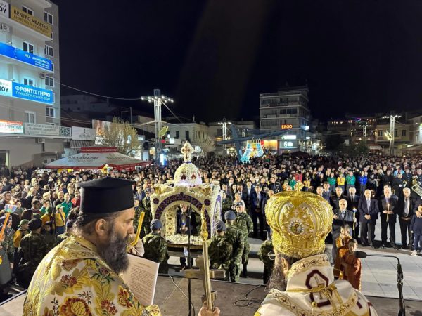 Η Λιτανεία μέσω των οδών Γεωργίου Β΄, Ερμού, Τάσου Σεχιώτη έφθασε στην πλατεία Πετρινού, όπου τελέσθηκε Δέησις και οι Χορωδίες της πόλεως έψαλαν τα Εγκώμια.
