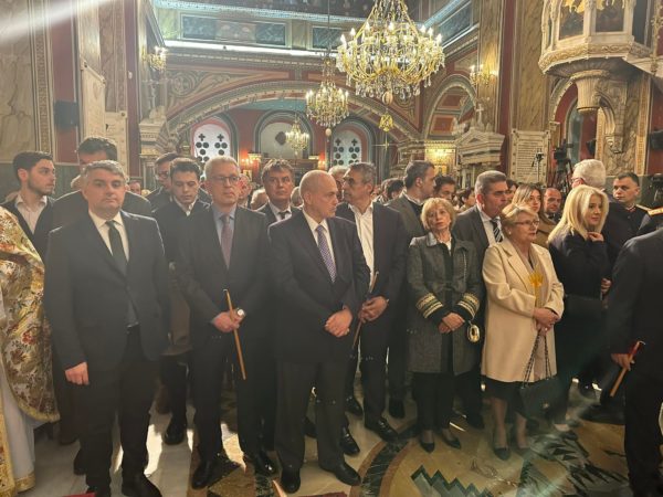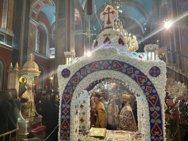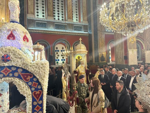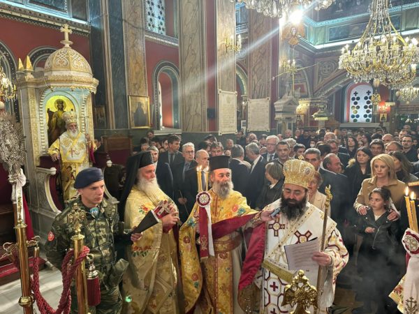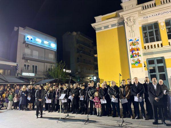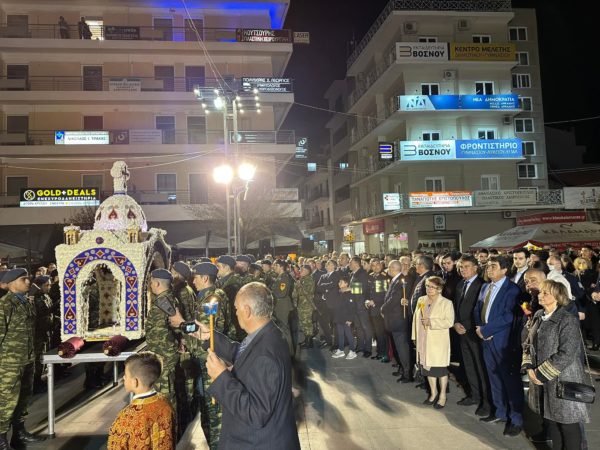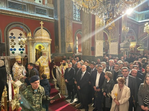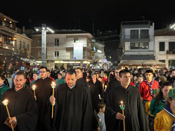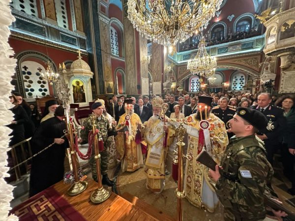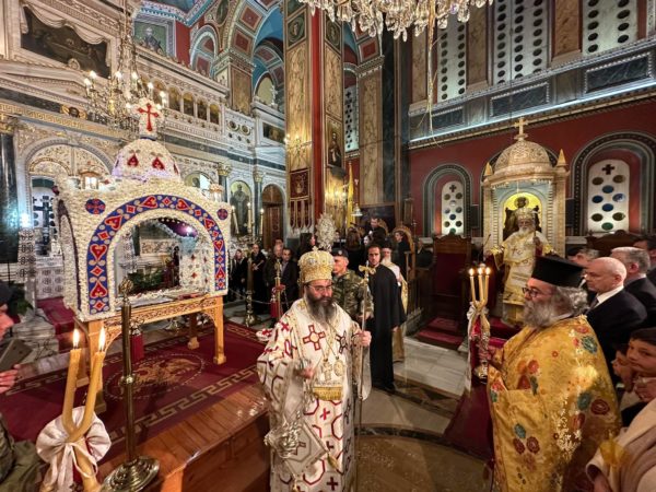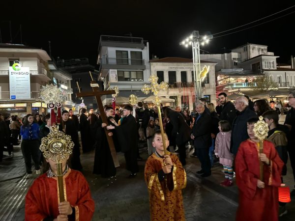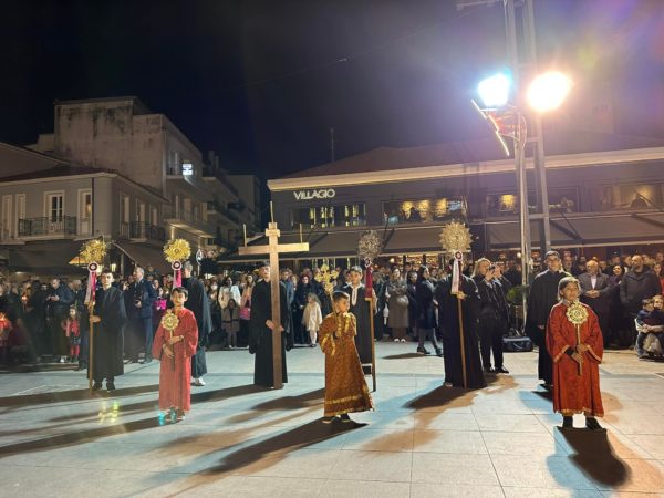 Η Λιτανεία μέσω των οδών Γεωργίου Β΄, Ερμού, Τάσου Σεχιώτη έφθασε στην πλατεία Πετρινού, όπου τελέσθηκε Δέησις και οι Χορωδίες της πόλεως έψαλαν τα Εγκώμια.