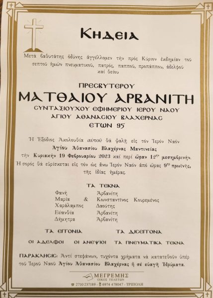 Η Εξόδιος Ακολουθία αυτού θα ψαλεί την Κυριακήν 19 Φερβουαρίου 2023 στις 12 το μεσημέρι στον Ιερό Ναό Αγίου Αθανασίου Βλαχέρνης Μαντινείας.