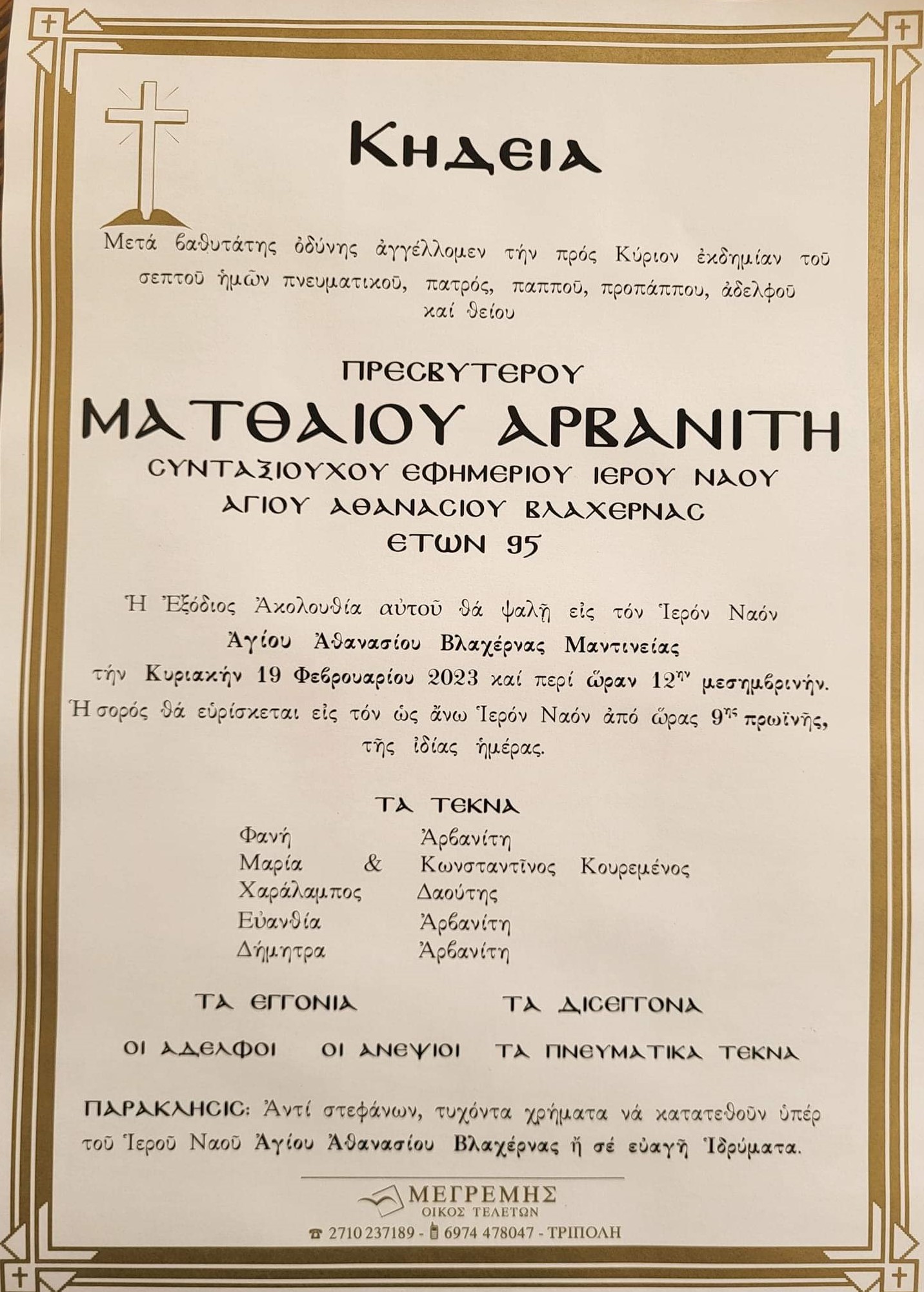 Η Εξόδιος Ακολουθία αυτού θα ψαλεί την Κυριακήν 19 Φερβουαρίου 2023 στις 12 το μεσημέρι στον Ιερό Ναό Αγίου Αθανασίου Βλαχέρνης Μαντινείας.