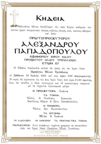 Η Εξόδιος Ακολουθία του μεταστάντος θα τελεσθή το Σάββατο 10 Ιουλίου 2021 και ώρα 5:00 μ.μ., στον Ιερό Ναό Προφήτου Ηλιού Τριπόλεως, υπό του Σεβασμιωτάτου Μητροπολίτου Μαντινείας και Κυνουρίας κ. Αλεξάνδρου.