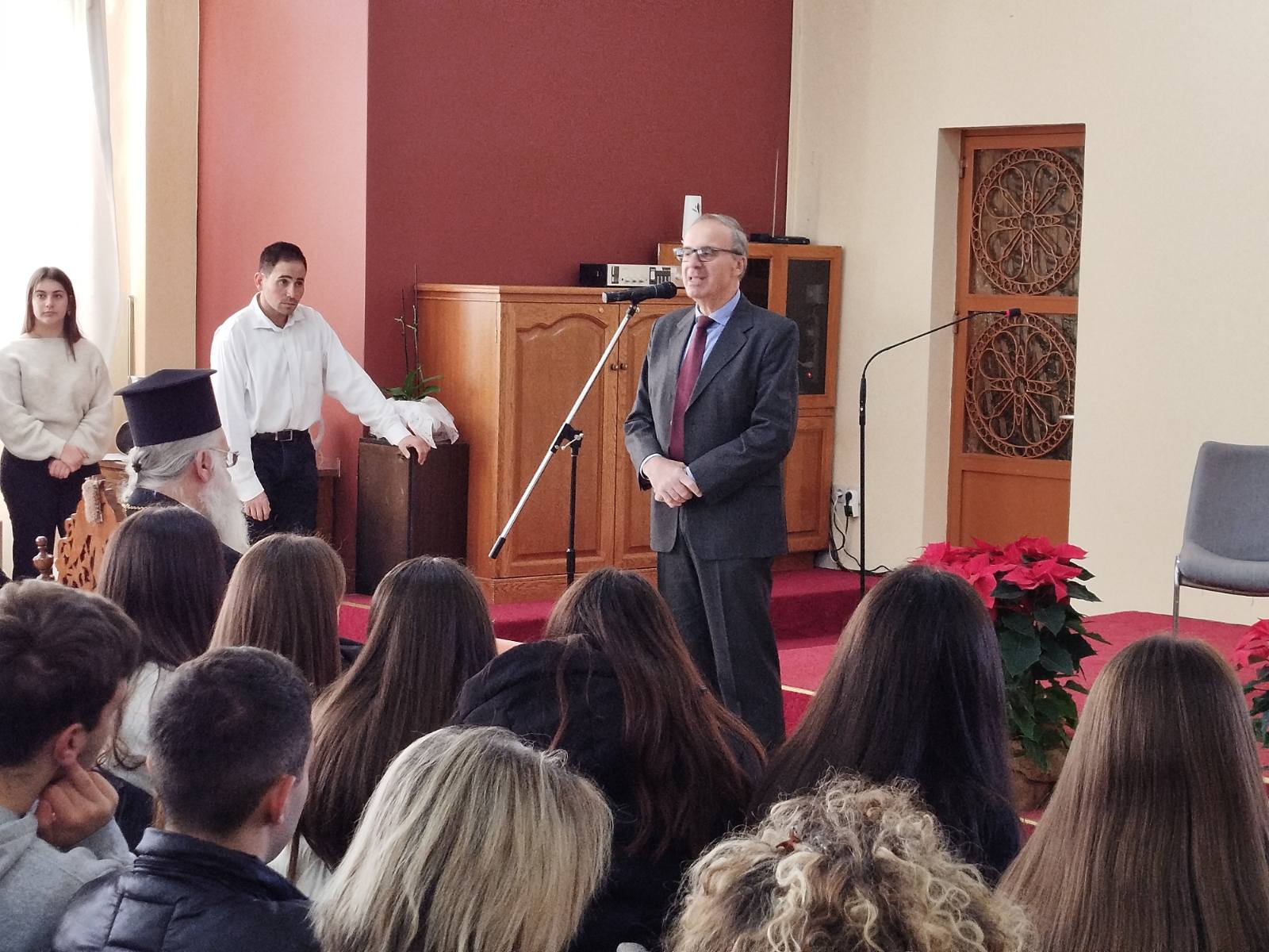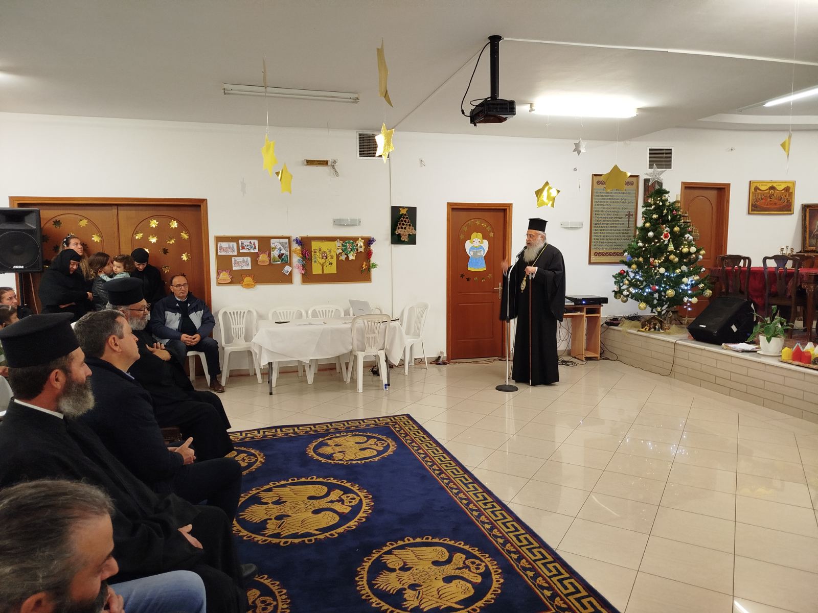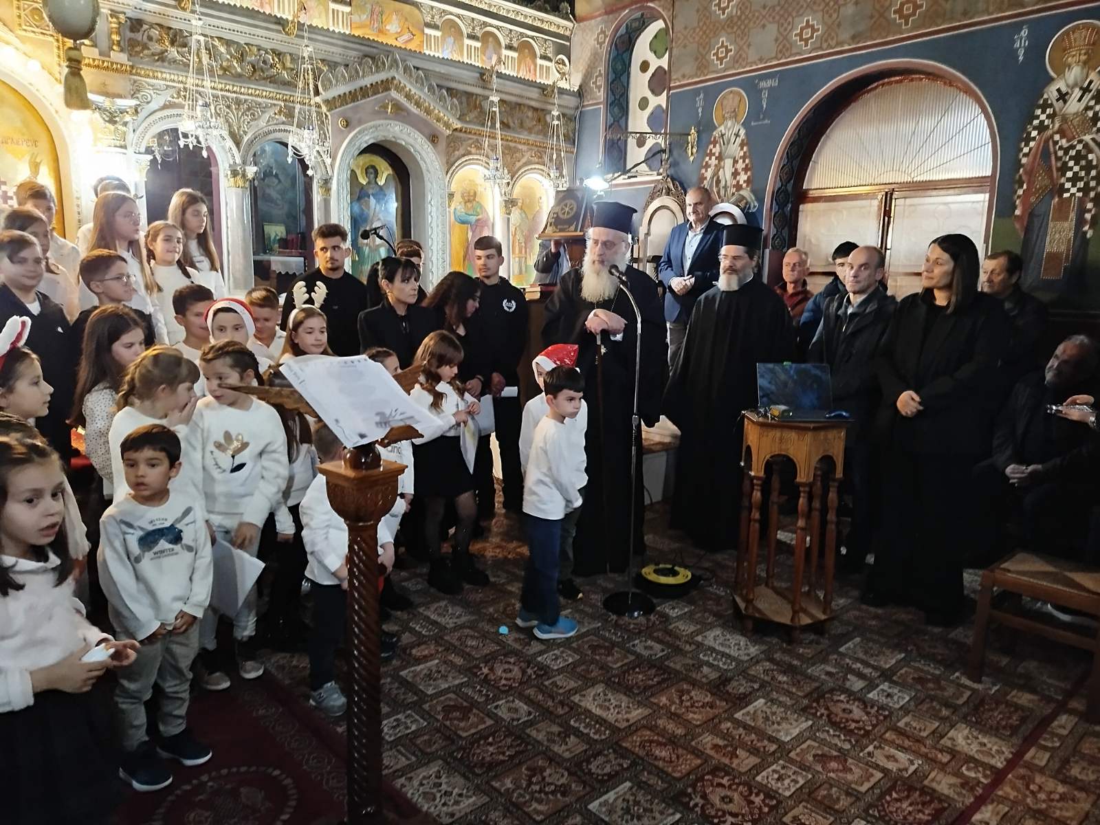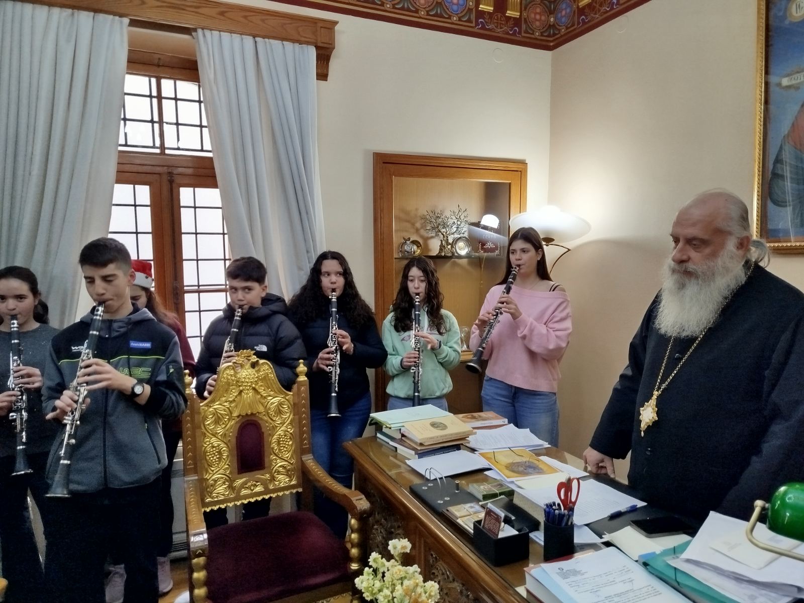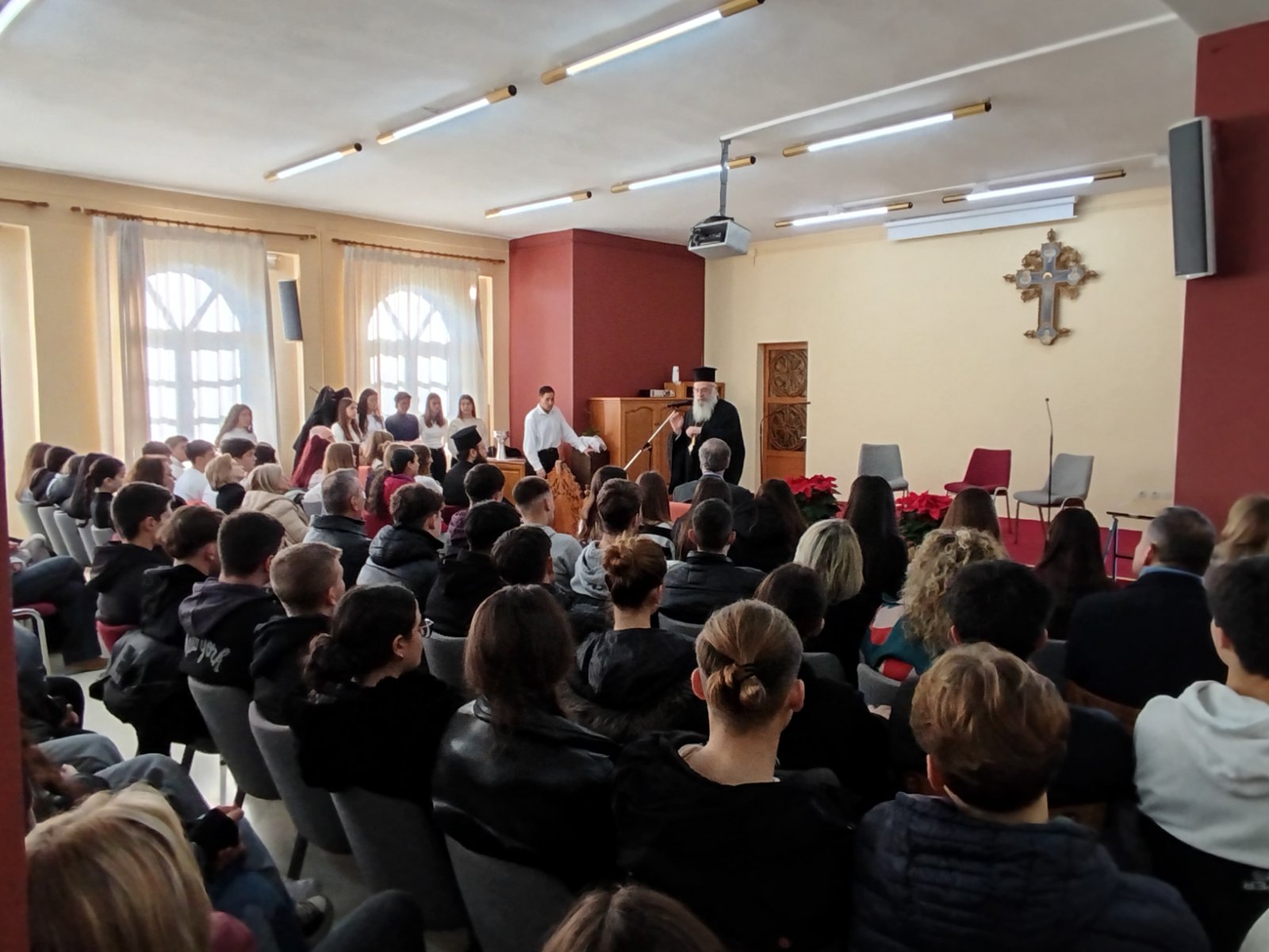 Το πρωί, ο Σεβασμιώτατος δέχθηκε στο Πνευματικό Κέντρο του Ιερού Ναού Αγίας Βαρβάρας Τρίπολης τους μαθητές του 4ου Γενικού Λυκείου Τρίπολης, στους οποίους μίλησε για το μέγα γεγονός της ενανθρωπήσεως του Κυρίου μας Ιησού Χριστού και το νόημα της εορτής των Χριστουγέννων.
