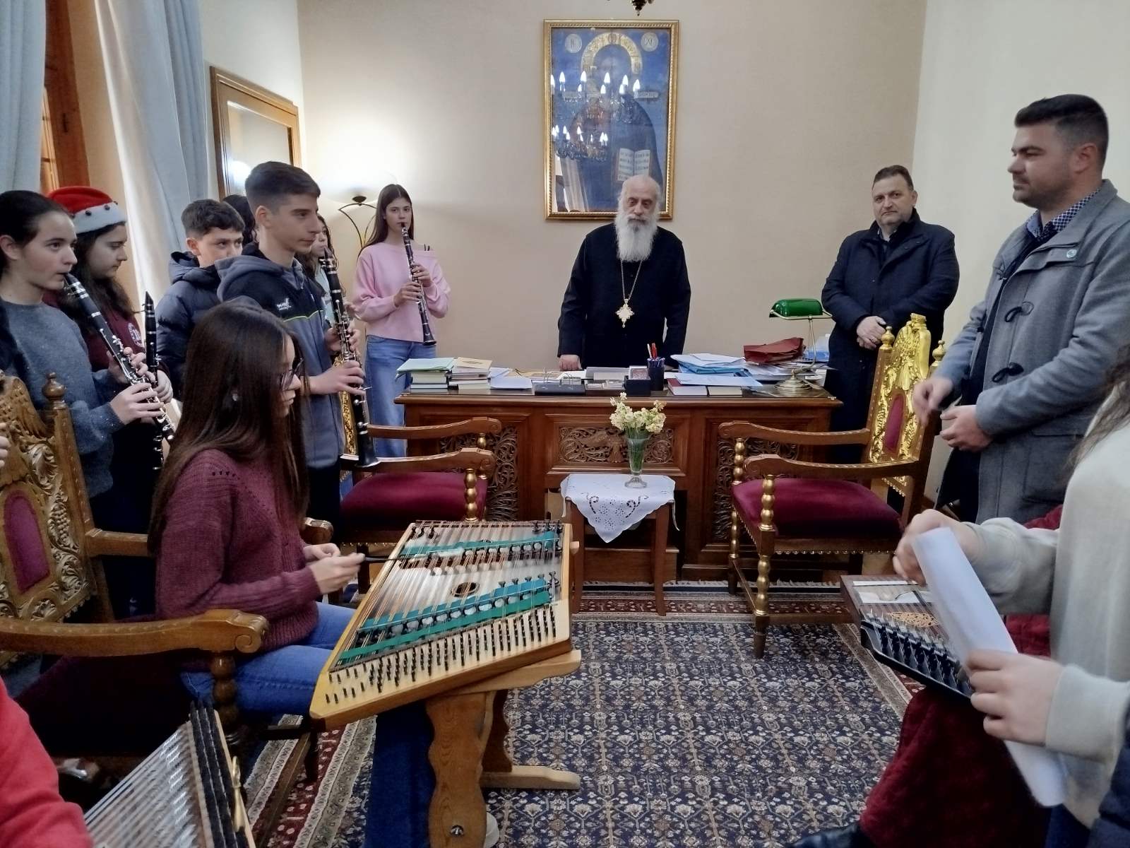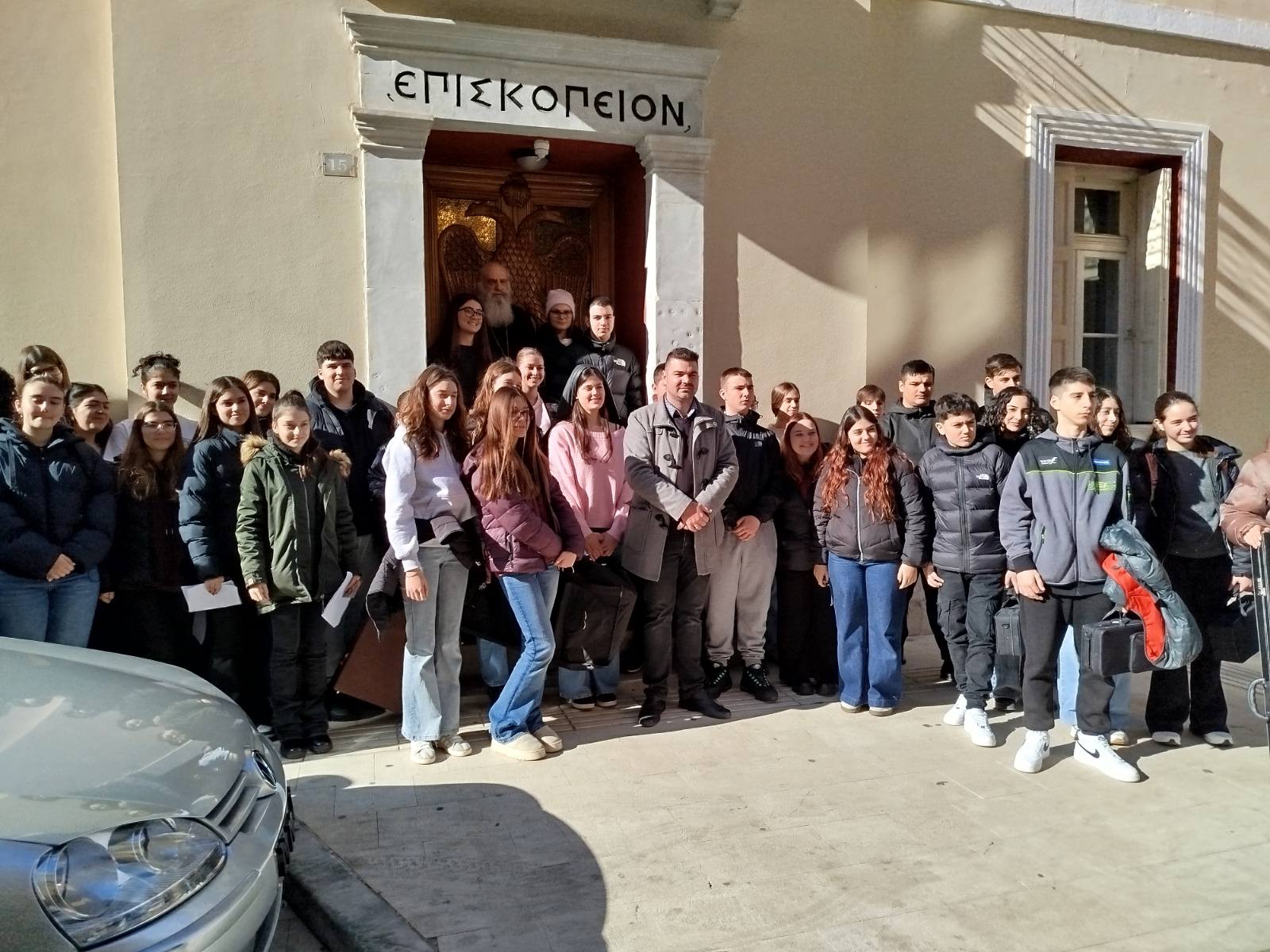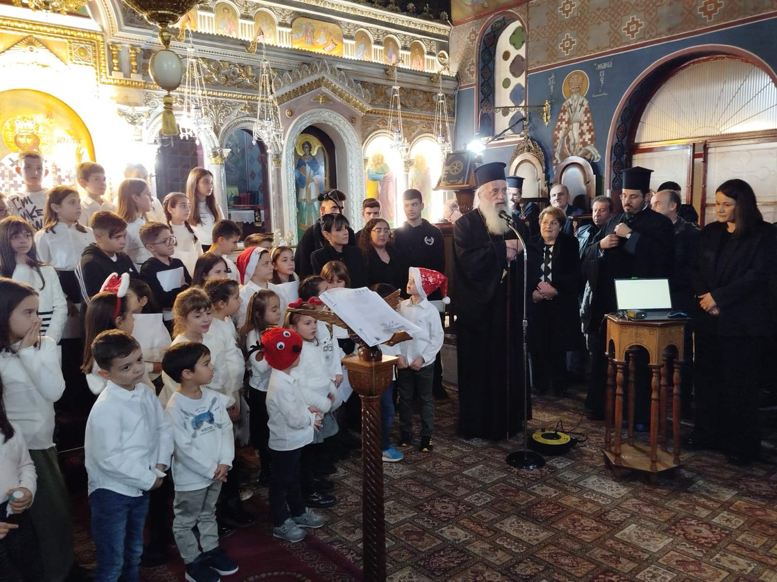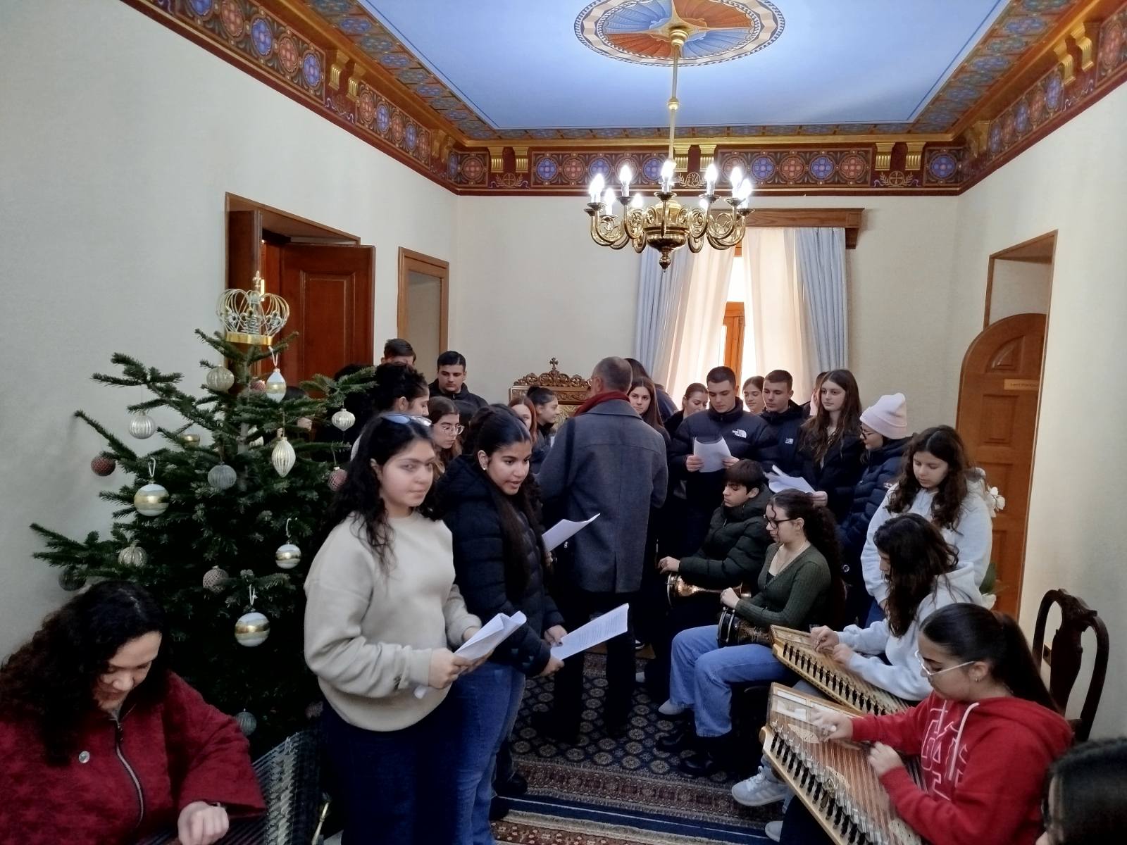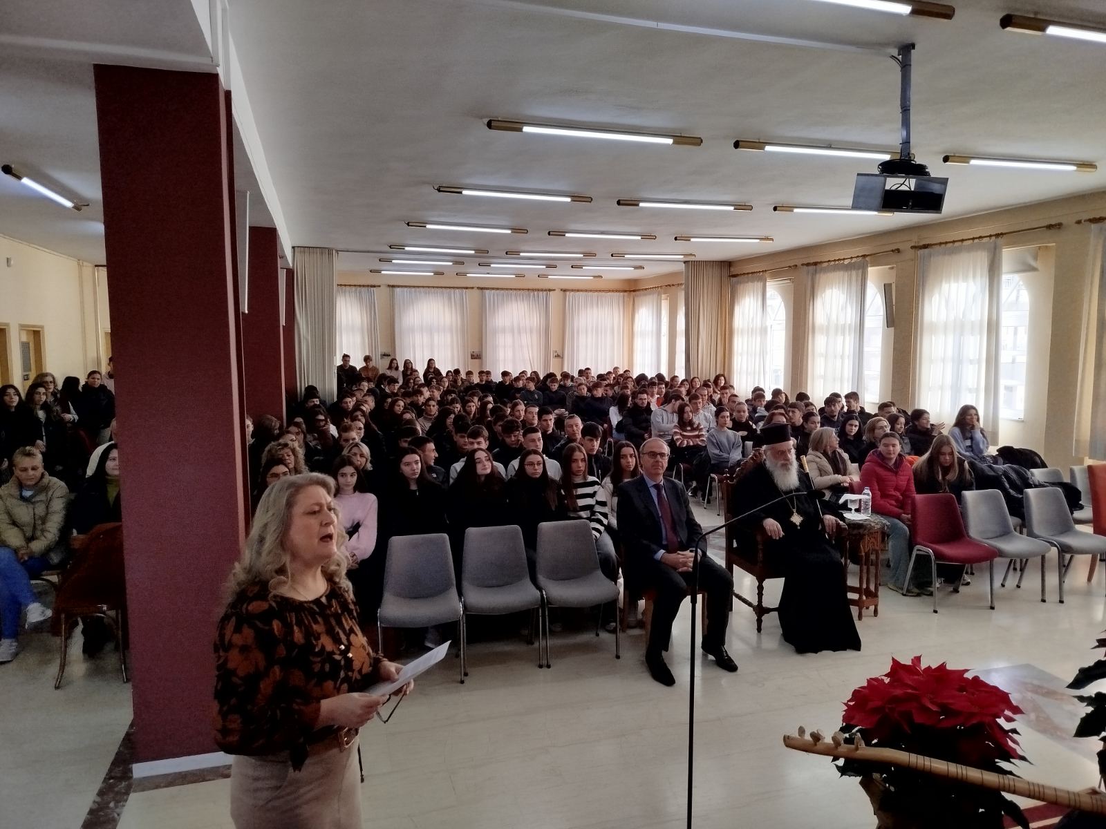 Το πρωί, ο Σεβασμιώτατος δέχθηκε στο Πνευματικό Κέντρο του Ιερού Ναού Αγίας Βαρβάρας Τρίπολης τους μαθητές του 4ου Γενικού Λυκείου Τρίπολης, στους οποίους μίλησε για το μέγα γεγονός της ενανθρωπήσεως του Κυρίου μας Ιησού Χριστού και το νόημα της εορτής των Χριστουγέννων.