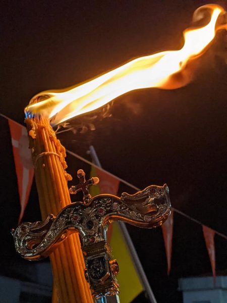 Ο Σεβασμιώτατος κ. Αλέξανδρος, με το «Δεύτε λάβετε φως», διένειμε το άγιο Φως έως το προαύλιο του Ναού, ανέγνωσε την ευαγγελική περικοπή και έψαλε μετά δυνάμεως τον αναστάσιμο παιάνα «Χριστός ανέστη».