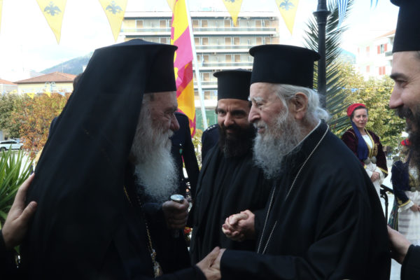 Εν συνεχεία χαιρετισμό απηύθυνε ο Σεβ. Μητροπολίτης Καρυστίας και Σκύρου κ. Σεραφείμ, ο οποίος έλκη την καταγωγή του από την Αρκαδία και είχε υπηρετήσει επί εξαετία ως Ιεροκήρυκας της Μητροπόλεως Μαντινείας και Κυνουρίας. O Μητροπολίτης κ. Σεραφείμ προέτρεψε τον νέο Μητροπολίτη να διατηρήσει τα δύο βασικά χαρακτηριστικά που διακρίνουν τον τόπο, τον ηρωισμό και τον αγιασμό.