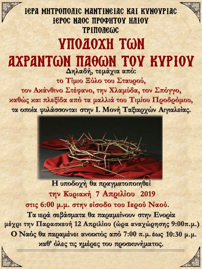 Η Τρίπολη υποδέχεται τα Άχραντα Πάθη του Κυρίου, δηλαδή τμήματα από το Τίμιο Ξύλο του Σταυρού, τον Ακάνθινο Στέφανο, τη Χλαμύδα, τον Σπόγγο καθώς και πλεξίδα από τα μαλλιά του Τιμίου Προδρόμου, τα οποία φυλάσσονται στην Ι. Μονή Ταξιαρχών Αιγιαλείας. Η υποδοχή θα πραγματοποιηθεί την Κυριακή 7 Απριλίου 2019 στις 18:00 στην είσοδο του Ι.Ν. Προφήτου Ηλίου στην Τρίπολη. Τα ιερά σεβάσματα θα παραμείνουν στην ενορία μέχρι την Παρασκευή 12 Απριλίου (ώρα αναχώρησης 09:00). Ο ναός θα είναι ανοικτός καθ’ όλες τις ημέρες του προσκυνήματος από τις 07:30 ως τις 22:30.