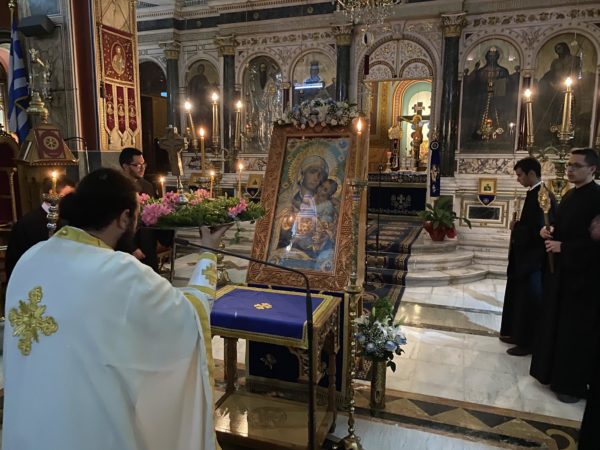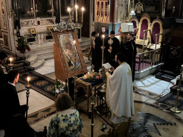 Περί που στις 19:00 τελέσθηκε η Ακολουθία του Εσπερινού στον Μητροπολιτικό Ιερό Ναό του Αγίου Βασιλείου της Τριπόλεως, κατόπιν ακολούθησε η Λιτάνευση της ιεράς Εικόνος πέριξ του Ναού και ακολούθησε η πρώτη ιερά Παράκλησις με την συμμετοχή των ευσεβών χριστιανών.