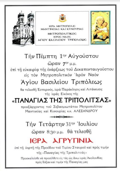 Την Πέμπτη 1η Αυγούστου 2019 και ώρα 19.00 της εσπέρας, επί τη ευκαιρία της ενάρξεως του Δεκαπενταύγουστου, εις τον Μητροπολιτικόν Ιερόν Ναόν Αγίου Βασιλείου Τριπόλεως θα τελεσθή Εσπερινός και ιερά Παράκλησις και Λιτάνευσις της ιεράς Εικόνος της “ΠΑΝΑΓΙΑΣ ΤΗΣ ΤΡΙΠΟΛΙΤΣΑΣ”, προεξάρχοντος του Μητροπολίτου Μαντινείας και Κυνουρίας, κ. Αλεξάνδρου.