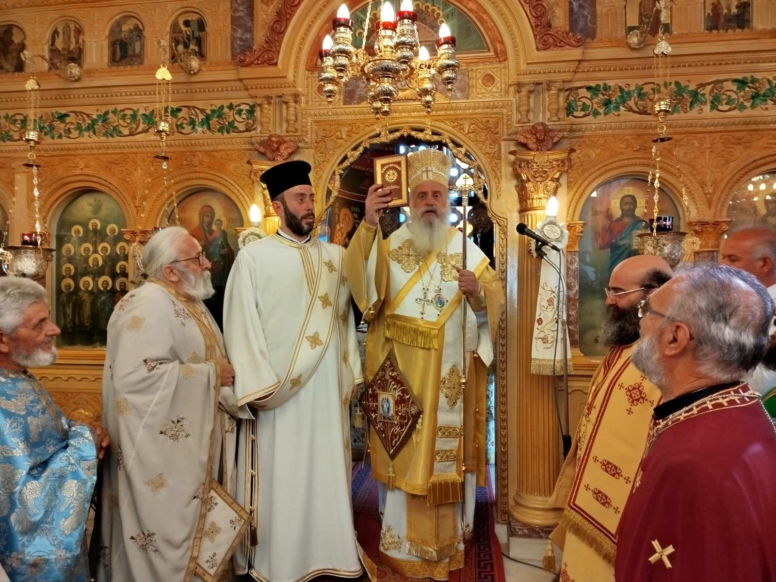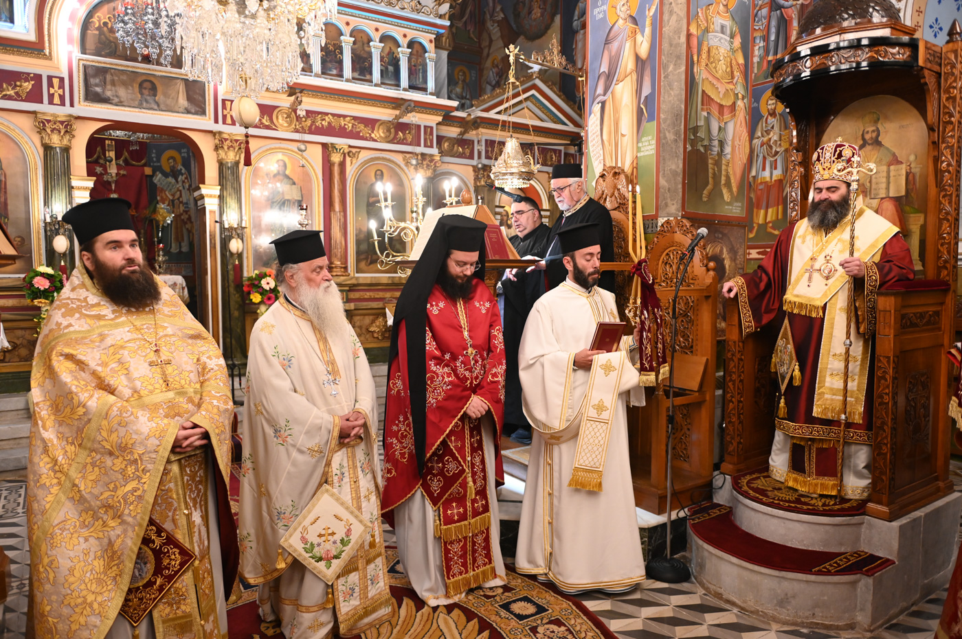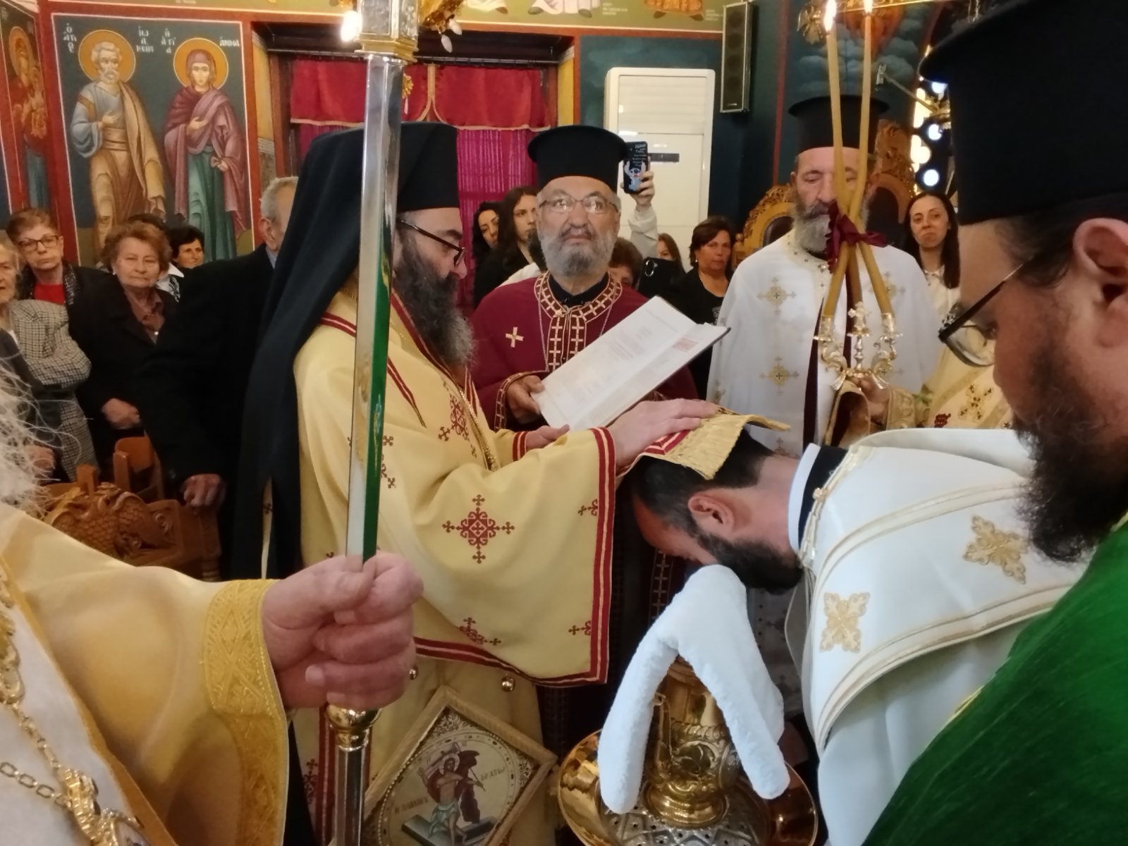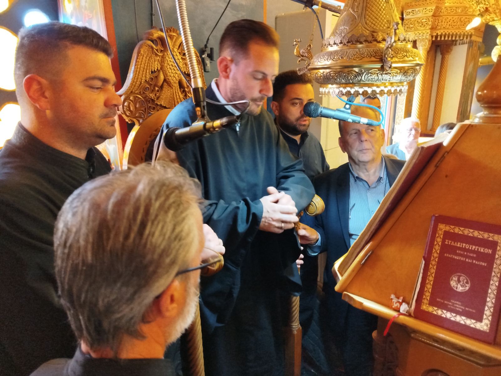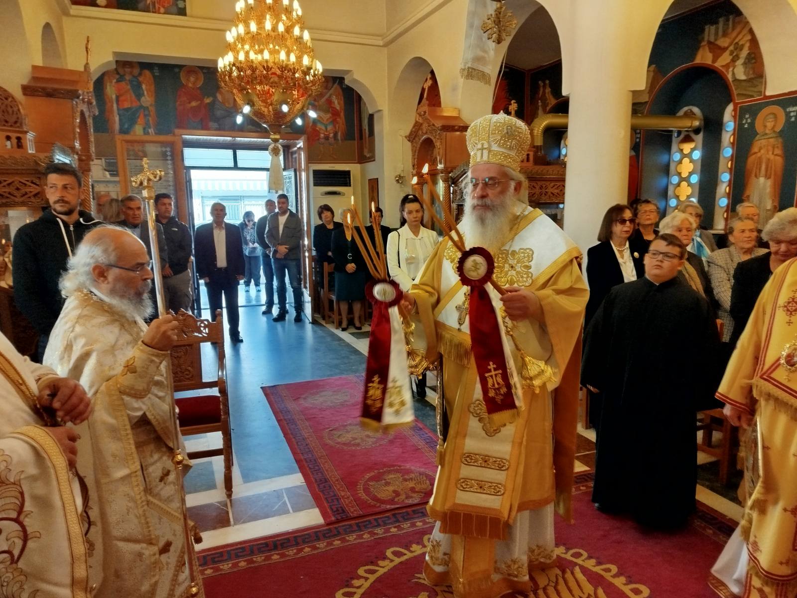 Πιστοί κατέκλυσαν τον πανηγυρίζοντα Ιερό Ναό του Αγίου Γεωργίου, με σκοπό να συμμετάσχουν στην Θεία Λειτουργία, να προσκυνήσουν τμήμα Ιερού Λειψάνου του εορταζομένου Αγίου και να ευχηθούν τα δέοντα στο νέο κληρικό της Μητροπόλεως.