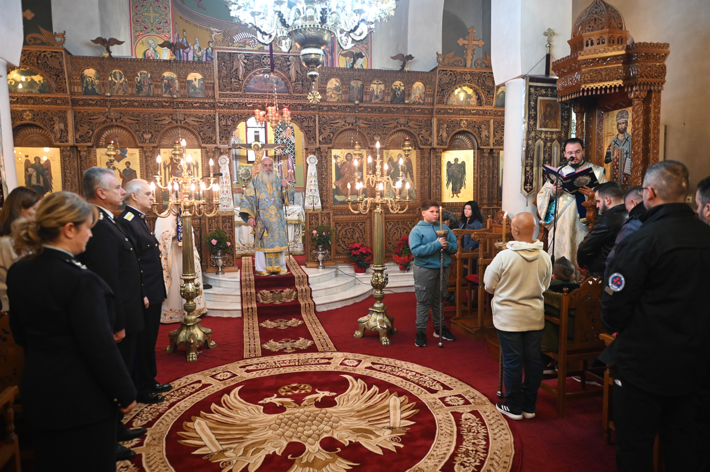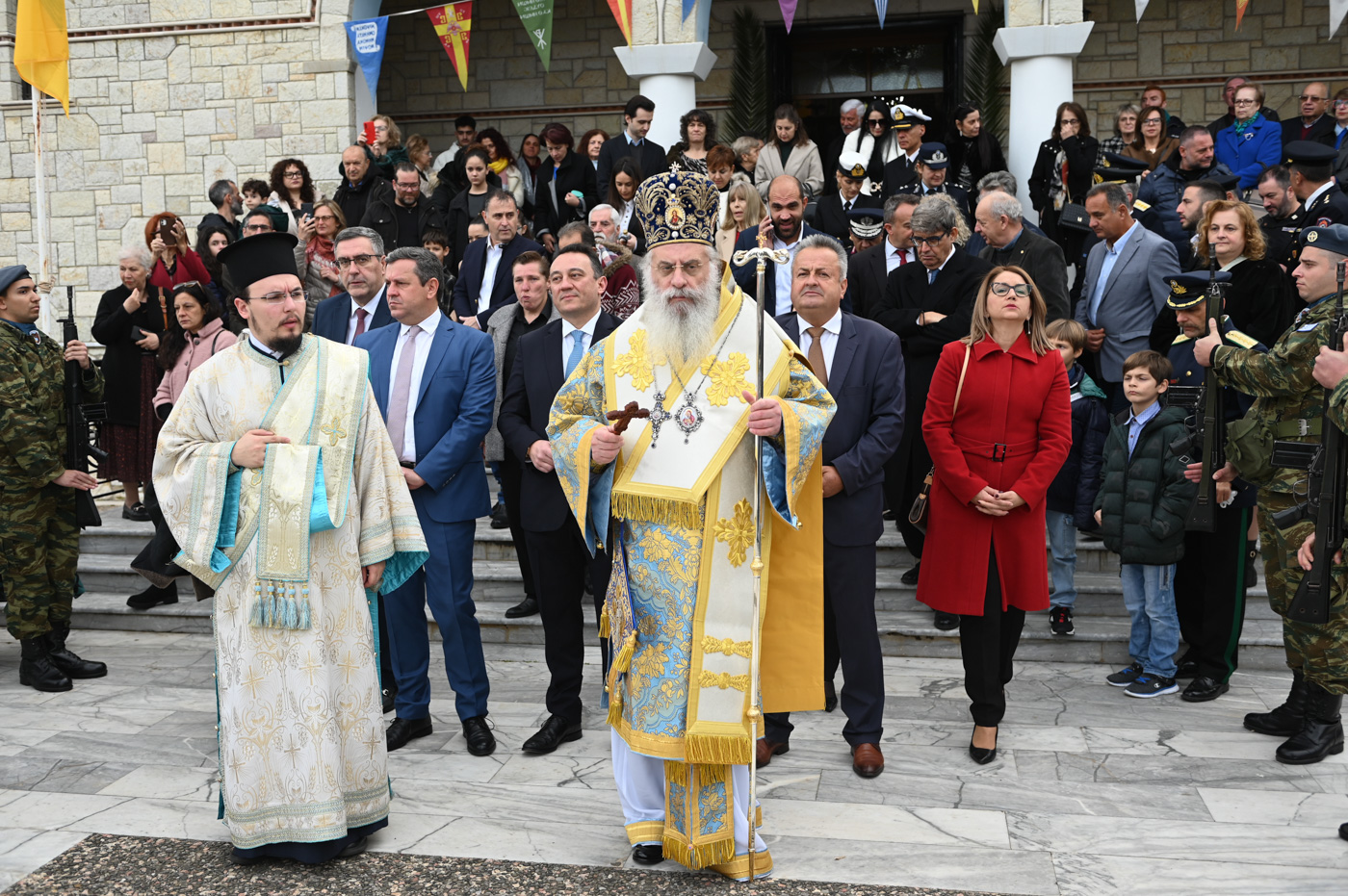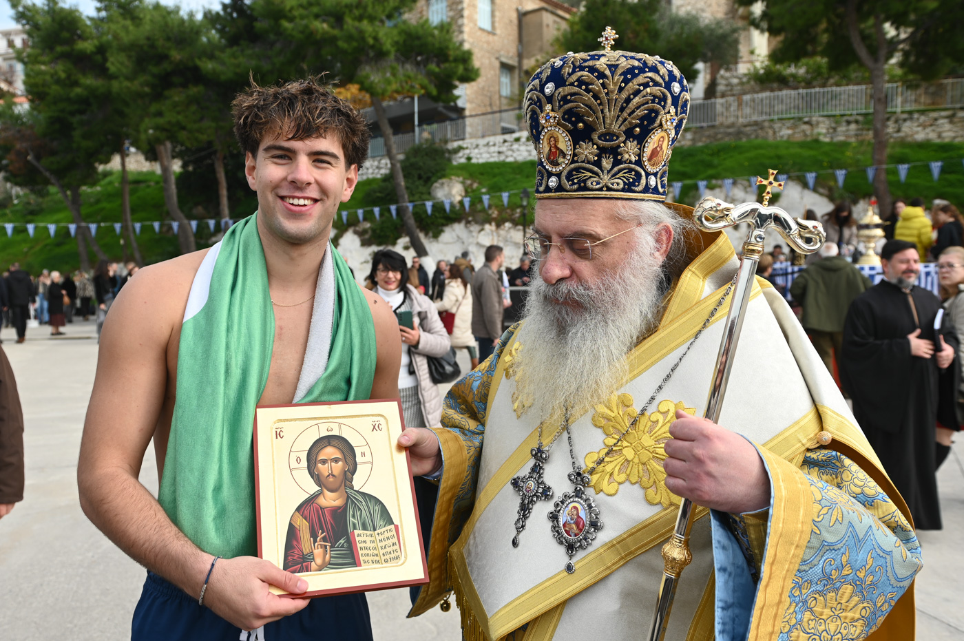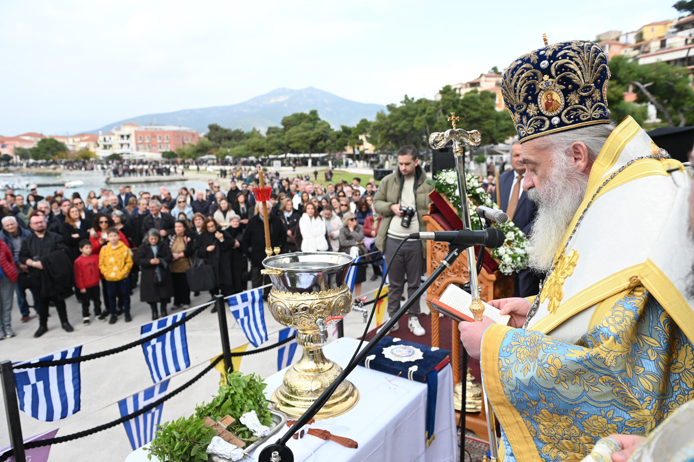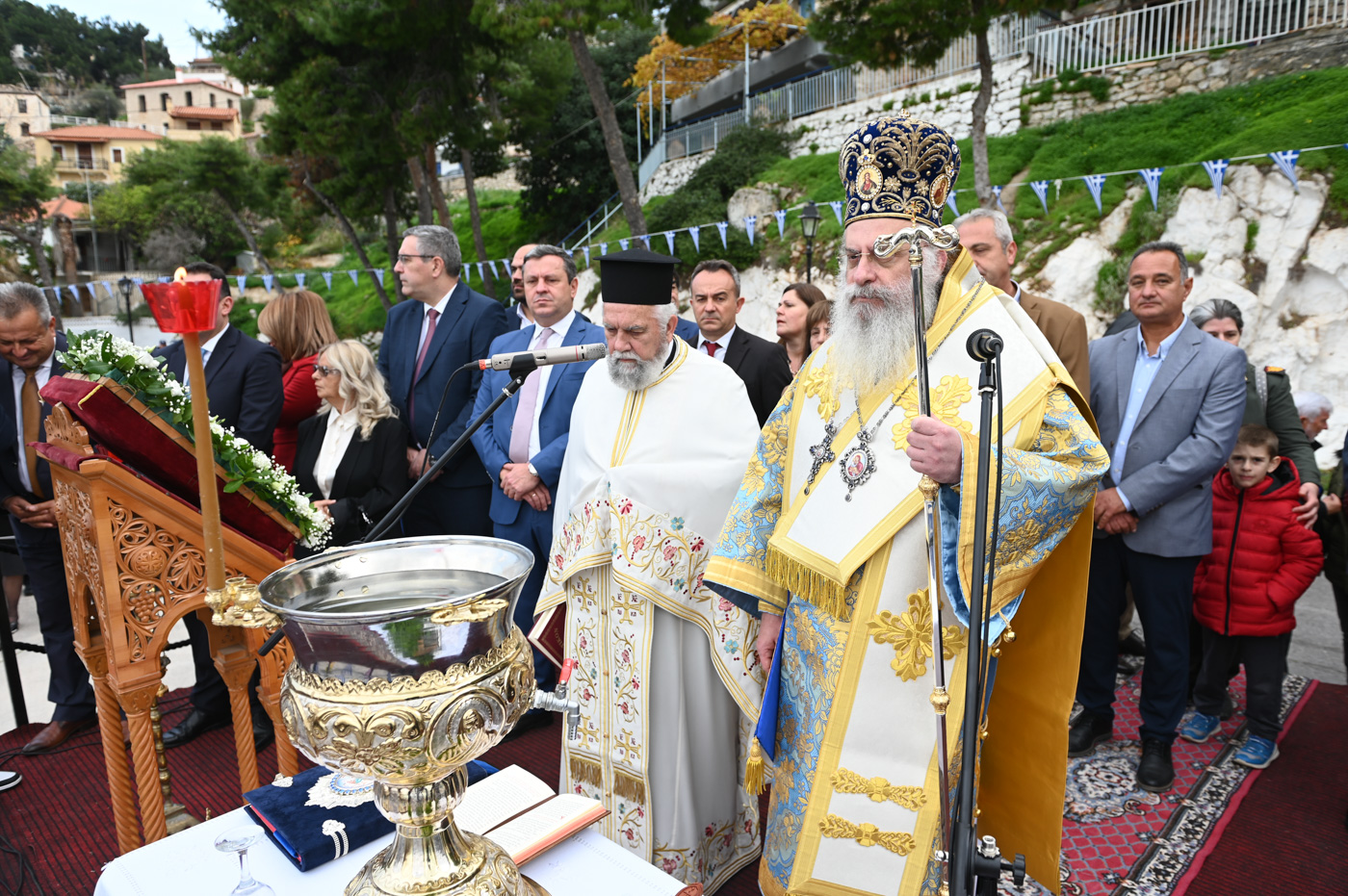 Με το πέρας της Θείας Λειτουργίας, και με λιτανευτική πομπή ο Μητροπολίτης κ. Επιφάνιος και οι Ιερείς, εν μέσω πλήθους πιστών, κατευθύνθηκαν στο λιμάνι, όπου έλαβε χώρα η Ακολουθία του Μεγάλου Αγιασμού, η κατάδυση του Τιμίου Σταυρού και ο καθαγιασμός των υδάτων. Κολυμβητές έπεσαν στη θάλασσα για να ανασύρουν τον Τίμιο Σταυρό, αλλά και να λάβουν την χάρη και ευλογία του.