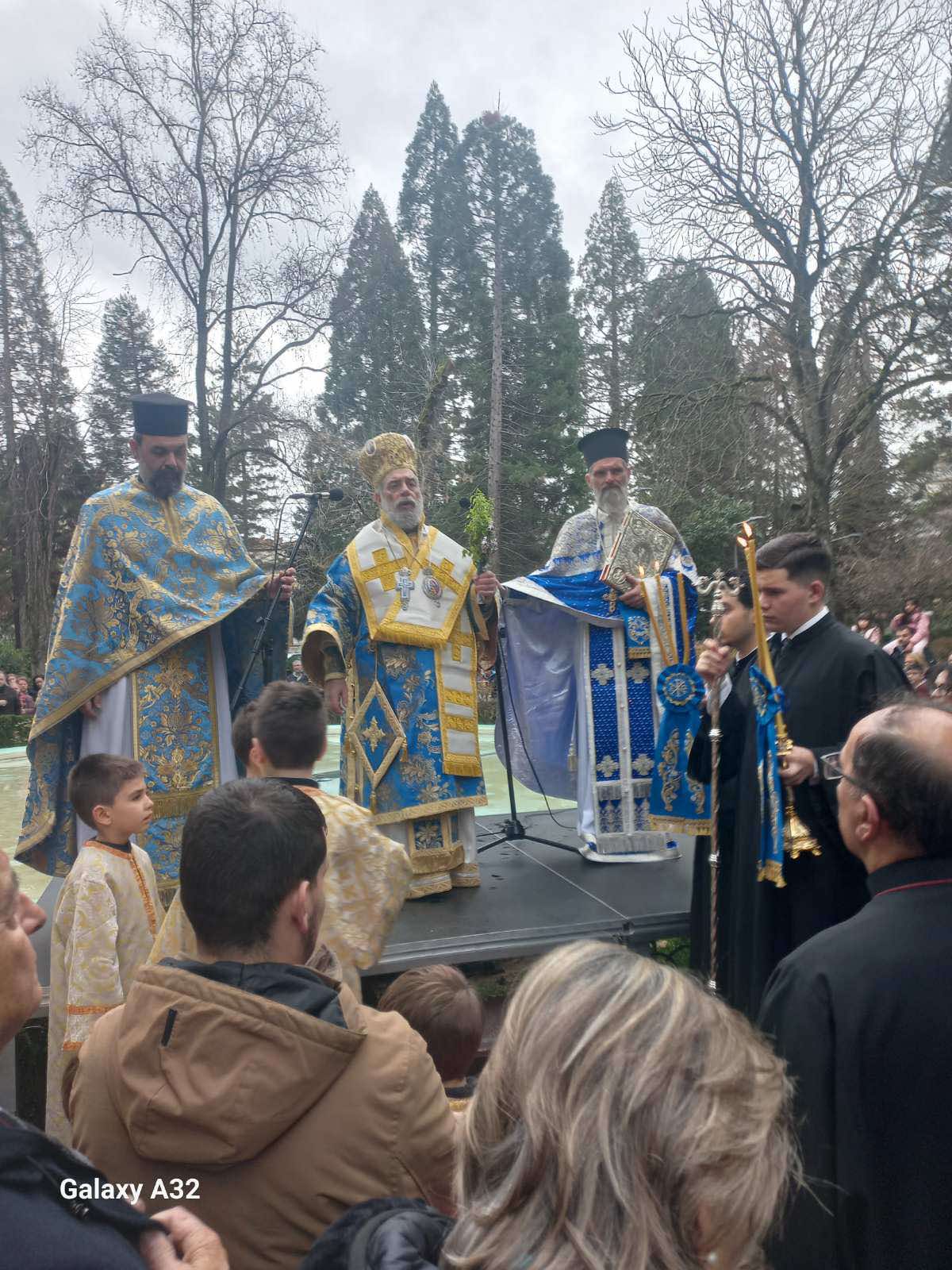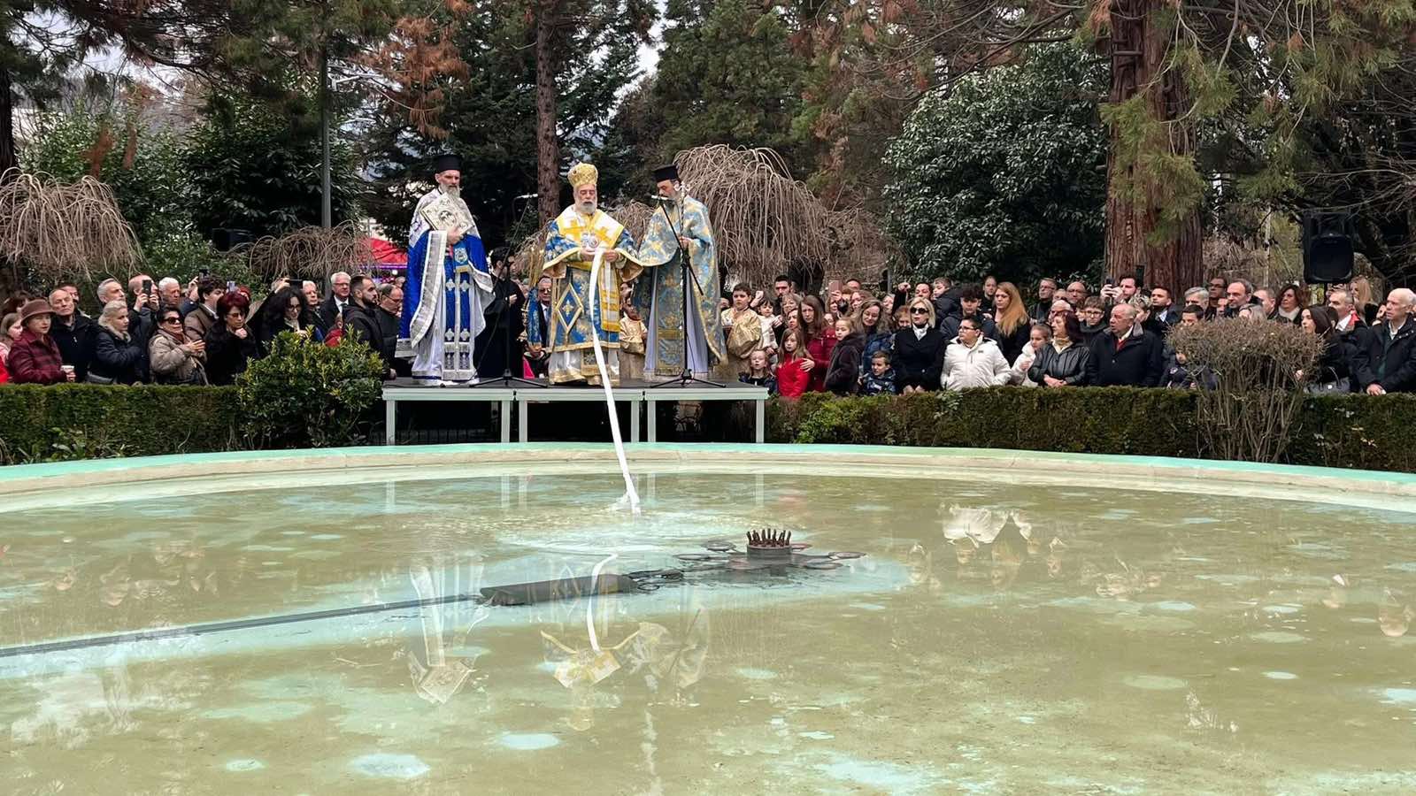 Με το πέρας της Ακολουθίας του Αγιασμού, ο Μητροπολίτης κ. Γαβριήλ, μετά των Ιερέων, των αρχόντων και τους πραγματοποίησαν την ρίψη του Τιμίου Σταυρού στο συντριβάνι του πάρκου Φιλλοδένδρων πλησίον του Ναού.