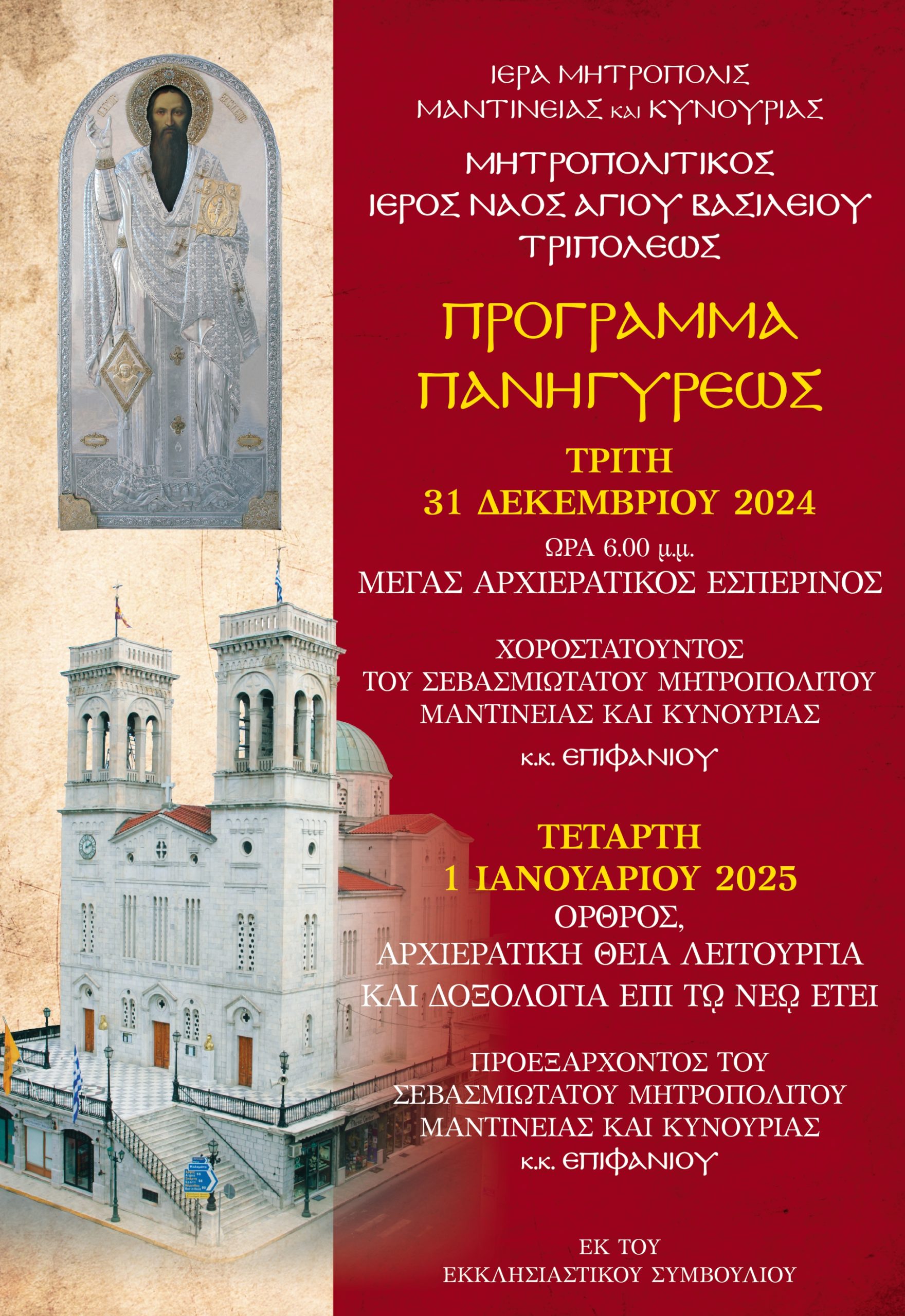 Η Ιερά Μητρόπολη Μαντινείας και Κυνουρίας ανακοινώνει προς τον ευσεβή λαό το πρόγραμμα της επικείμενης πανηγύρεως του Ιερού Μητροπολιτική Ναού Αγίου Βασιλείου Τριπόλεως ως εξής: