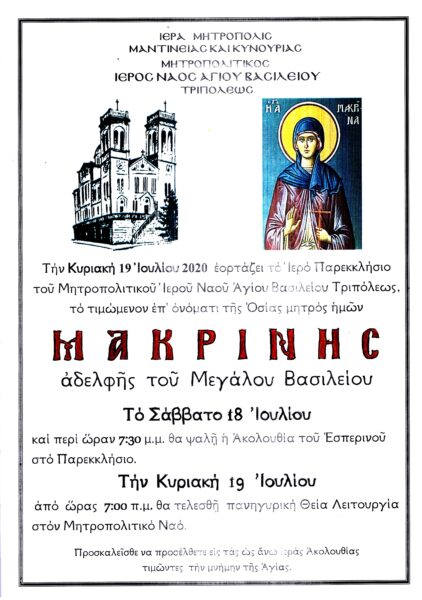 Την Κυριακή 19 Ιουλίου 2020 εορτάζει το Ιερό Παρεκκλήσιο του Μητροπολιτικού Ιερού Ναού Αγίου Βασιλείου Τριπόλεως, το τιμώμενον επ΄ ονόματι της Οσίας μητρός ημών Μ Α Κ Ρ Ι Ν Η Σ αδελφής του Μεγάλου Βασιλείου.