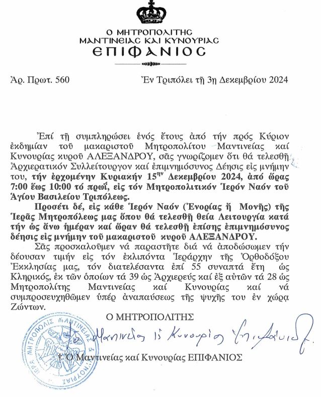 Με τη συμπλήρωση ενός έτους από την εις Κύριον εκδημία του μακαριστού Μητροπολίτη Μαντινείας και Κυνουρίας κυρού Αλεξάνδρου, θα τελεσθεί Αρχιερατικό Συλλείτουργο και επιμνημόσυνη δέηση εις μνήμην του, την ερχόμενη Κυριακή 15 Δεκεμβρίου, από 7πμ έως 10πμ , στον Μητροπολιτικό Ιερό Ναό του Αγίου Βασιλείου Τριπόλεως.