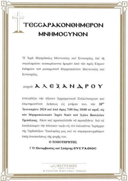 Την Κυριακή, 28 Ιανουαρίου 2024, στον Ιερό Μητροπολιτικό Ναό Αγίου Βασιλείου Τριπόεως θα τελεστεί το Τεσσαρακονθήμερο μνημόσυνο του μακαριστού Μητροπολίτη Μαντινείας και Κυνουρίας κυρού Αλεξάνδρου.
