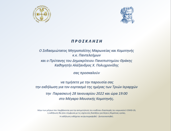 Εν όψει της Εορτής των Αγίων Πατέρων Μεγάλων Ιεραρχών και Οικουμενικών Διδασκάλων, Βασιλείου του Μεγάλου, Γρηγορίου του Θεολόγου και Ιωάννου του Χρυσοστόμου, προστατών και εφόρων της Παιδείας του Γένους ημών, η Ιερά Μητρόπολη Μαρωνείας και Κομοτηνής, διοργανώνει την Παρασκευή 28 Ιανουαρίου 2022 μια σειρά από εκδηλώσεις.