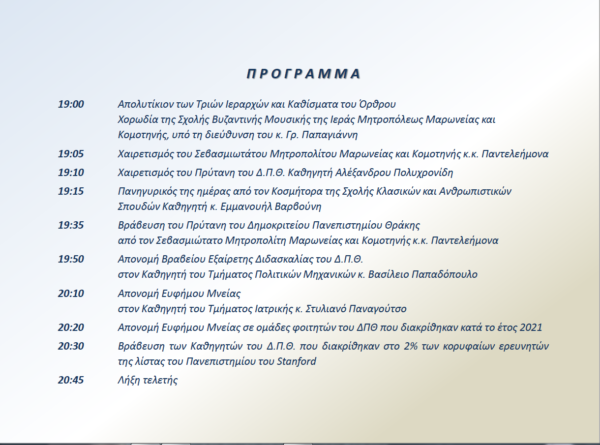 Επιπλέον, θα τιμηθεί με την ανωτάτη τιμητική διάκριση της Ιεράς Μητρόπολης ο Πρύτανης του Δημοκριτείου Πανεπιστημίου Θράκης, Καθηγητής κ. Αλέξανδρος Πολυχρονίδης, για την προσφορά του στην Εκπαίδευση.