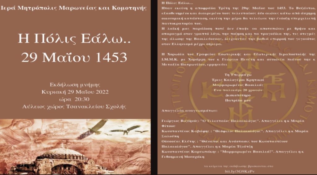 Με αφορμή την επέτειο της Αλώσεως της Βασιλευούσης των πόλεων η Ιερά Μητρόπολη Μαρωνείας θα πραγματοποιήσει την Κυριακή, 29 Μαΐου στις 20:30, στον αύλειο χώρο της Τσανακλείου Σχολής, Εκδήλωση Μνήμης με τίτλο : «Η Πόλις εάλω, 29 Μαΐου 1453».
