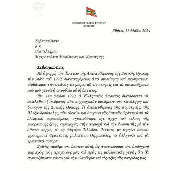 Επιστολή Αρχηγού Γ.Ε.Σ. προς Μητροπολίτη Μαρωνείας για την επέτειο απελευθέρωσης της Δυτικής Θράκης