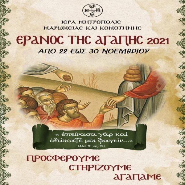 Η Ιερά Μητρόπολη Μαρωνείας και Κομοτηνής πραγματοποιεί και φέτος τον «Έρανο της Αγάπης», από την Δευτέρα 22 έως και την Κυριακή 30 Νοεμβρίου 2021.
