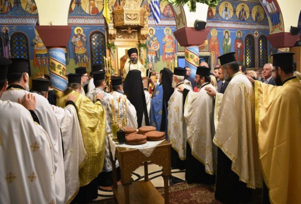 Εν συνεχεία ο Σεβασμιώτατος προέστη της Λιτανείας της Ιεράς Εικόνας, η οποία θα παραμείνει προς προσκύνηση και ευλογία των πιστών στον Ιερό Ναό και χοροστάτησε κατά την Ακολουθία του Εσπερινού.