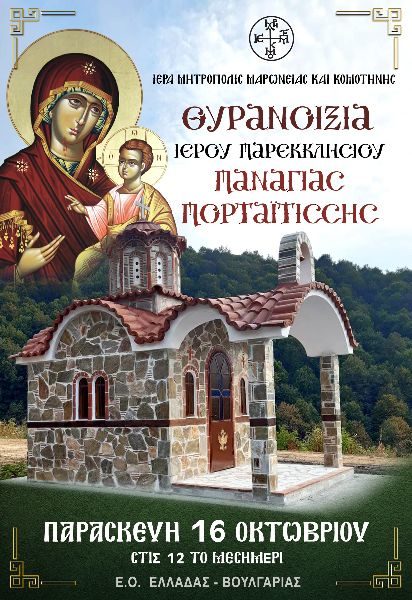 Την Παρασκευή 16 Οκτωβρίου και ώρα 12.00, ο Σεβασμιώτατος Μητροπολίτης Μαρωνείας και Κομοτηνής κ. Παντελεήμων θα τελέσει τα Θυρανοίξια του Ιερού Παρεκκλησίου της Παναγίας «Πορταιτίσσης», το οποίο τοποθετήθηκε εις την πύλην της εισόδου και εξόδου της χώρας μας, μετά της γείτονος Βουλγαρίας.
