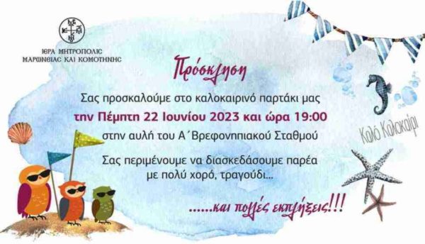 Το απόγευμα της Πέμπτης, 22ας Ιουνίου στις 19.00, στην αυλή του Α´ Βρεφονηπιακού Σταθμού, με την παρουσία του Μητροπολίτη Μαρωνείας και Κομοτηνής κ. Παντελεήμονος θα πραγματοποιηθεί η καλοκαιρινή γιορτή των Βρεφονηπιακών Σταθμών της Μητρόπολης.