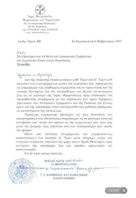 Ευχαριστήρια επιστολή προς το Σωματείο Καφεπωλών της Κομοτηνής απέστειλε ο Σεβασμιώτατος Μητροπολίτης Μαρωνείας και Κομοτηνής κ. Παντελεήμων.