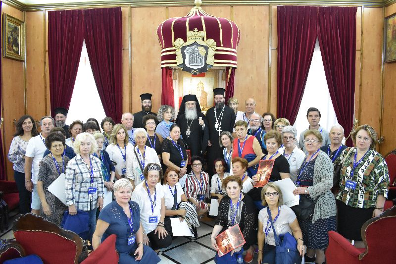 Τήν ἡμέραν τῆς ἀφίξεως τῶν προσκυνητῶν στά Πανάγια Προσκυνήματα, ἅπαντες προσεκύνησαν τον φρικτόν Γολγοθᾶν καί ἐν συνεχείᾳ τόν Πανάγιον καί Ζωοδόχον Τάφον, μετέβησαν δέ ἀκολούθως στήν αἴθουσαν τῆς ἕδρας τῆς Σιωνίτιδος Ἐκκλησίας, ὅπου ἐγένοντο δεκτοί ὑπό τοῦ σεπτοῦ Προκαθημένου Αὐτῆς Μακαριωτάτου Πατριάρχου Ἱερουσαλήμ καί πάσης Παλαιστίνης κ.κ. Θεοφίλου τοῦ Γ΄, ἐγκαρδίως ἀπηυθύνοντος λόγους οἰκοδομῆς καί παρακλήσεως περικοσμήσαντος κατόπιν τόν Ἐπίσκοπον μετ’ Ἀρχιερατικοῦ Ἐγκολπίου, καί τούς μέν Κληρικούς μετά Σταυροῦ ἐπιστηθίου, τούς δέ λαϊκούς μετ’ εὐλογίας.