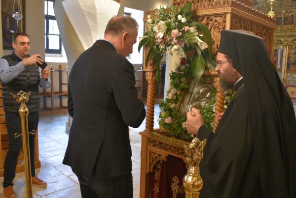 Ο Σεβασμιώτατος μίλησε στους επισκέπτες για την ιστορία του Ναού και για την αποπεράτωση των εργασιών ανακαινίσεως και συντηρήσεως αυτού.