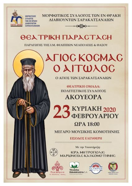 Ο Μορφωτικός Σύλλογος τῶν ἐν Θράκῃ διαβιούντων Σαρακατσαναίων, μέ τη συνεργασία τῆς Ἱερᾶς Μητροπόλεως Μαρωνείας καί Κομοτηνῆς, διοργανώνουν σήμερα στις 18.00 στό Μέγαρο Μουσικῆς Κομοτηνῆς θεατρική παράσταση, μέ θέμα: «Ὁ Ἃγιος Κοσμάς ὁ Αἰτωλός» μέ τήν θεατρική ὁμάδα πολιτιστικοῦ Συλλόγου ¨Ακουεορα.¨
