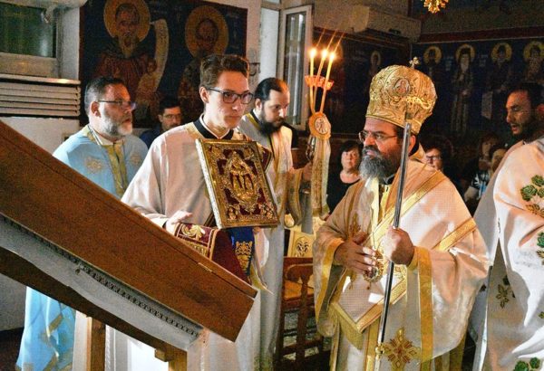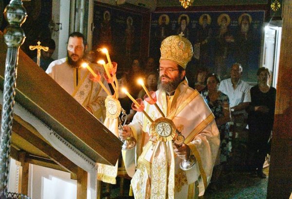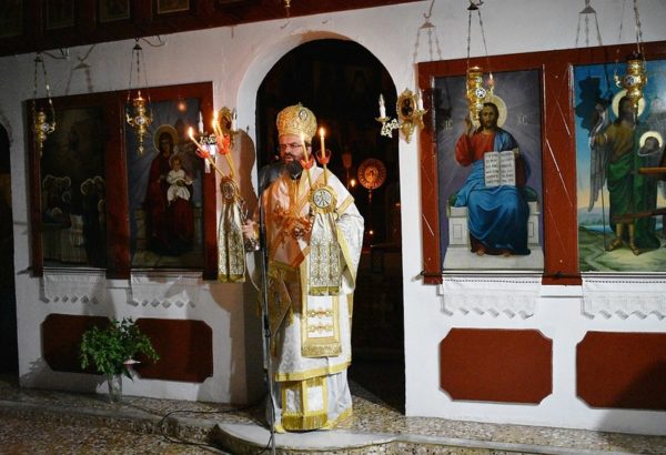 Εν συνεχεία ο Σεβασμιώτατος χοροστάτησε κατά την Ακολουθία του Παρακλητικού Κανόνος προς την Υπεραγία Θεοτόκο και ιερούργησε στην Ιερά Αγρυπνία στον αυτόν Ιερό Ναό.