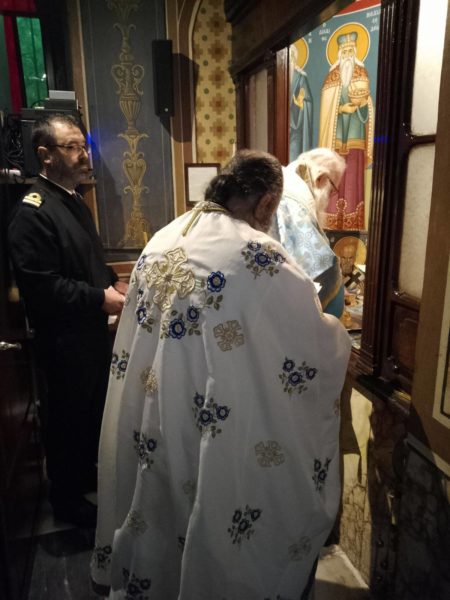 Την παραμονή της εορτής τελέστηκε ο Μέγας Πανηγυρικός Εσπερινός με αρτοκλασία και Θείο κήρυγμα όπου ο Στρατιωτικός Ιερέας του ΓΕΝ Αρχιμανδρίτης Αλέξιος Ιστρατόγλου Σχης (ΣΙ) αναφέρθηκε στην μεγάλη αυτή εκκλησιαστική προσωπικότητα του εορταζομένου Αγίου τον οποίο η Εκκλησία τον αποκαλεί Πανάγιο, αλλά και στην ιδιαίτερη σχέση του με το Ναυτικό μας και γενικότερα με κάθε άνθρωπο που βρίσκεται στη θάλασσα και παλεύει με τα κύματα και αγωνίζεται για την διαφύλαξη των θαλάσσιων συνόρων της χώρας μας.